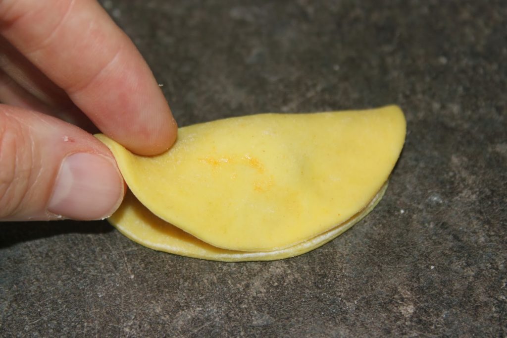 - Prenez un cercle de pâte et retournez-le. Normalement le dessous est moins fariné et collera sans avoir besoin d’ajouter d’eau pour fermer le pastel.