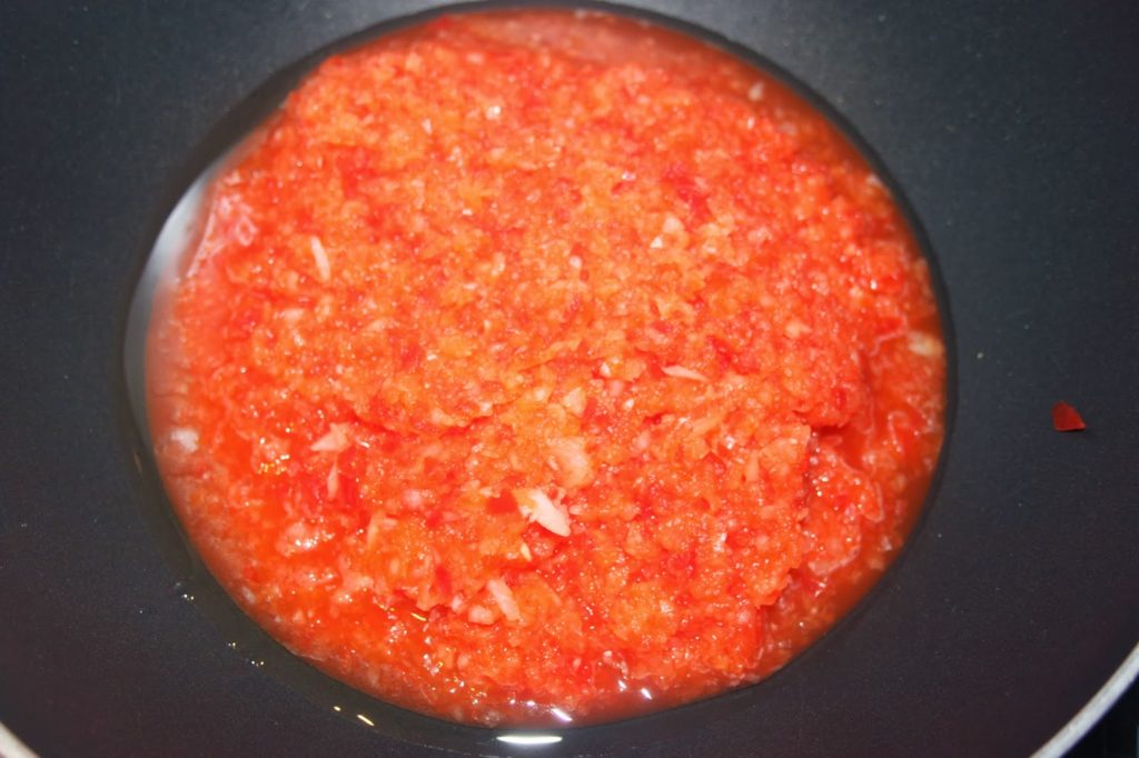- Mettez une poêle sur feu assez vif et versez l’huile. Ajoutez la purée de légumes.