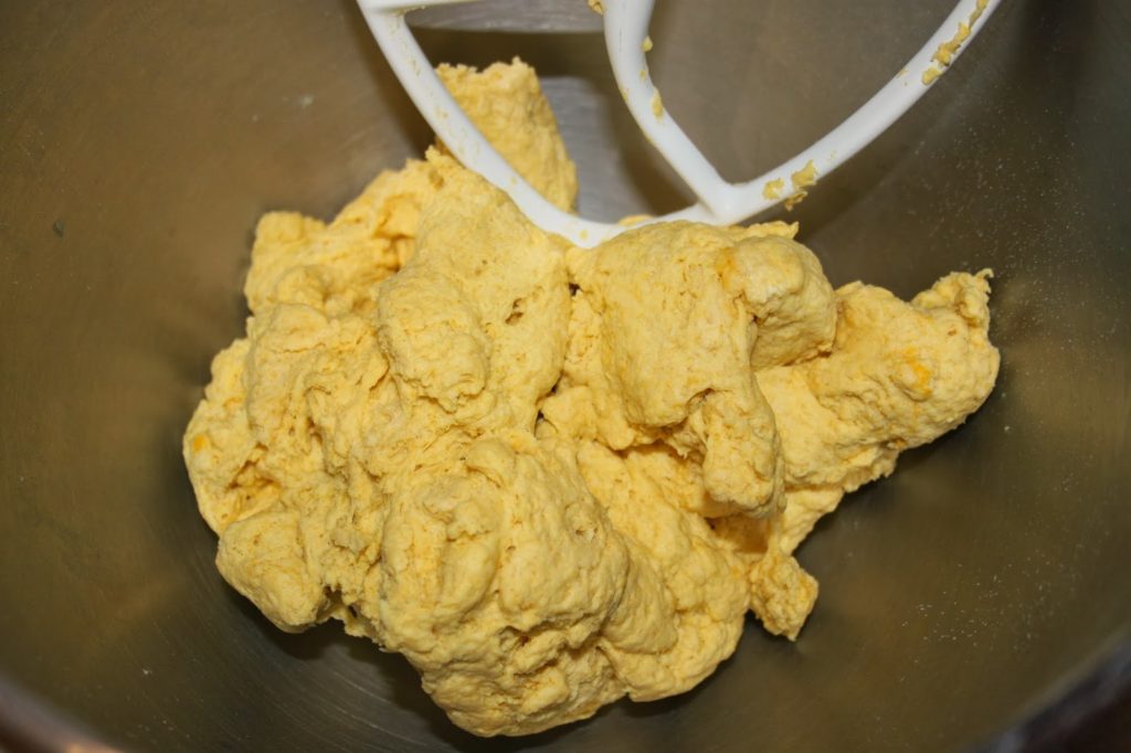 - Placez la margarine, l’huile d’olive, le sel, la levure chimique, le curcuma et la farine dans la cuve d’un robot ou dans un bol.