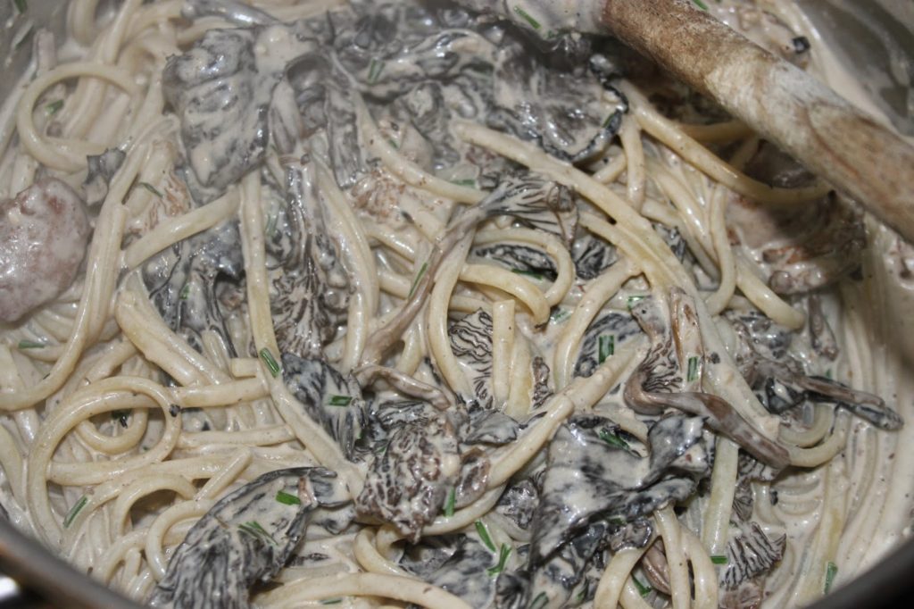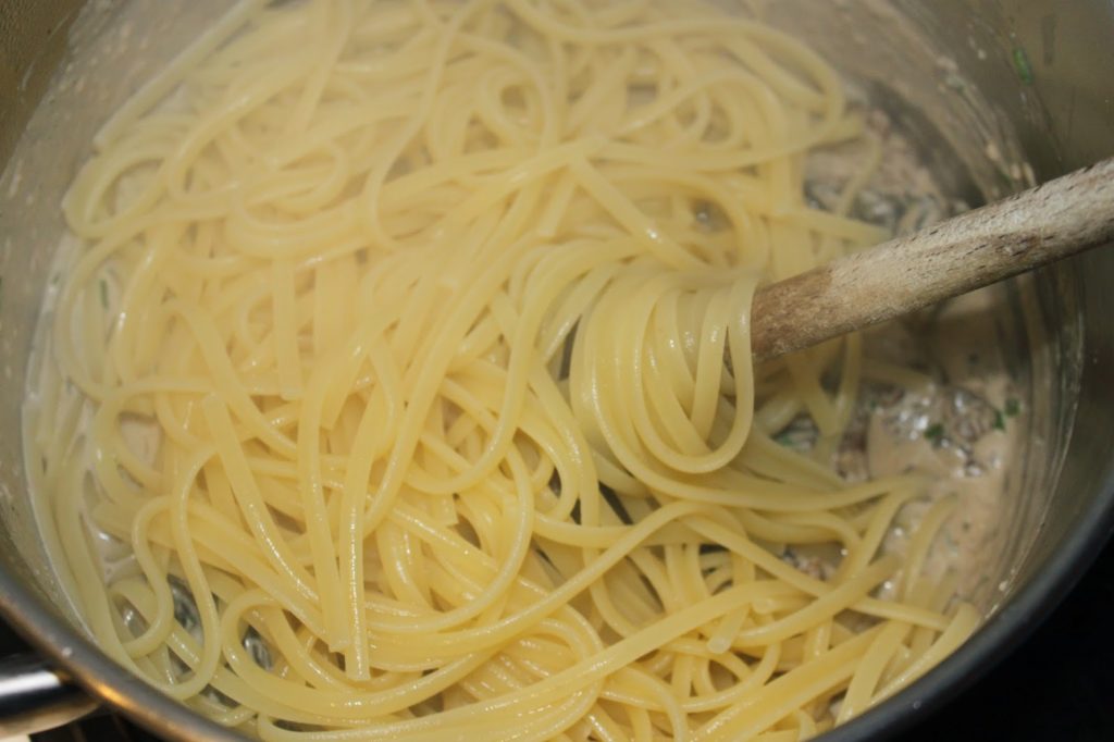 - Faites cuire vos pâtes « al dente » dans de l’eau bouillante salée. J’enlève toujours une minute de cuisson par rapport à la recommandation « al dente » car je fais recuire un peu les pâtes dans la sauce. Gardez un peu d’eau de cuisson. Quand elles sont cuites, versez-les directement dans la poêle et ajoutez deux cuillerées à soupe d’eau de cuisson.
