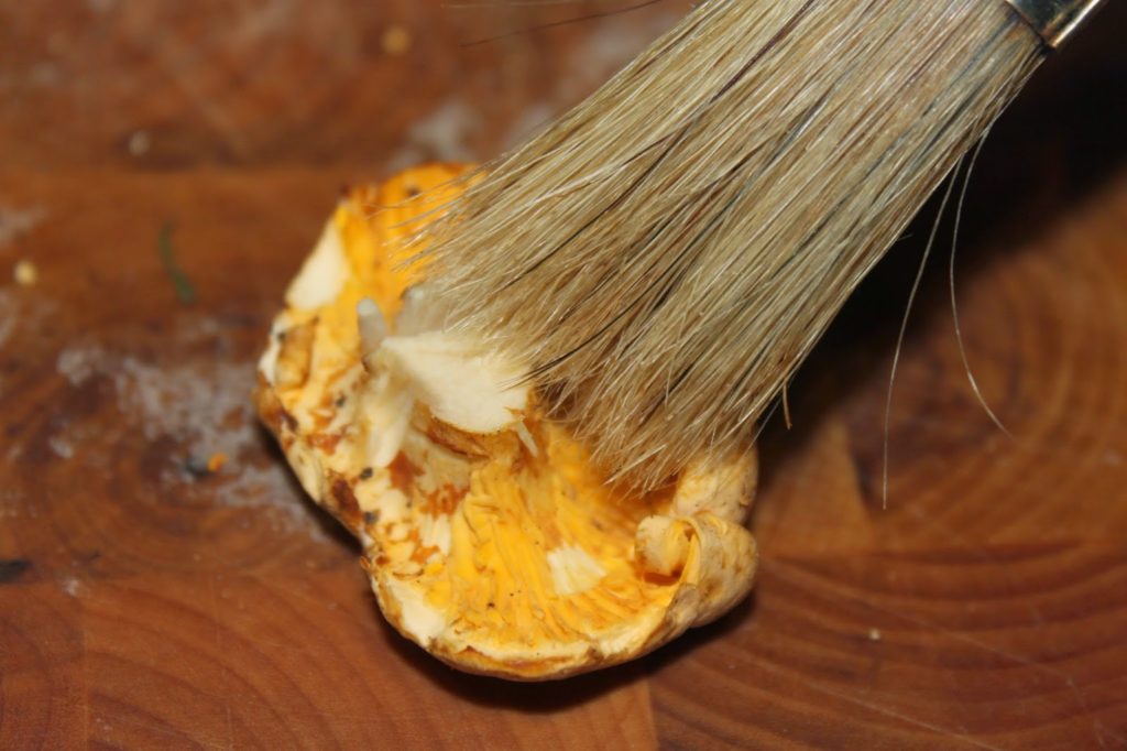 - Pour les girolles, enlevez le sable et/ou la terre avec une brosse à champignons ou un pinceau. Il ne faut pas les laver car elles se gorgeraient d’eau et perdraient leur goût délicat ! Ce n’est pas si long que cela à faire…