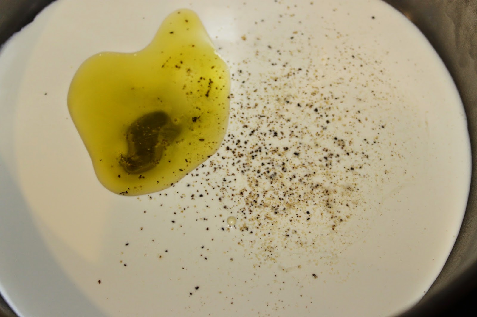 - Dans une grande casserole, versez la crème, l’huile d’olive, le sel, le poivre et un peu de noix de muscade.