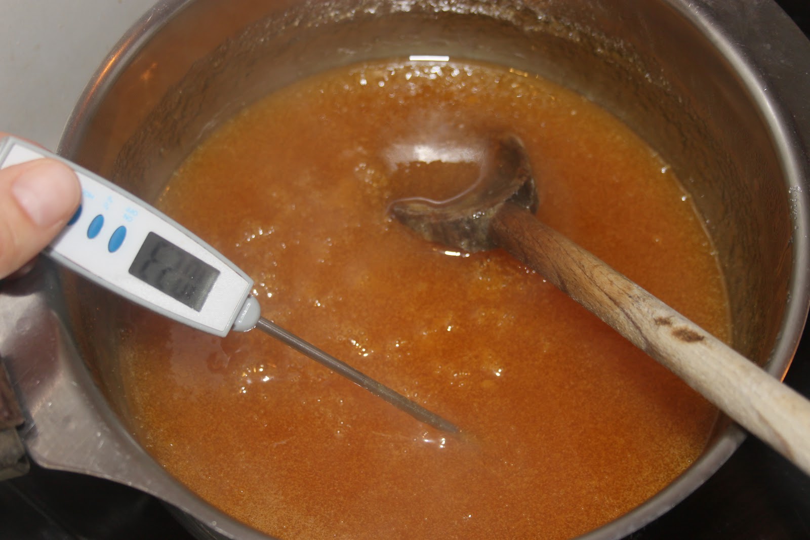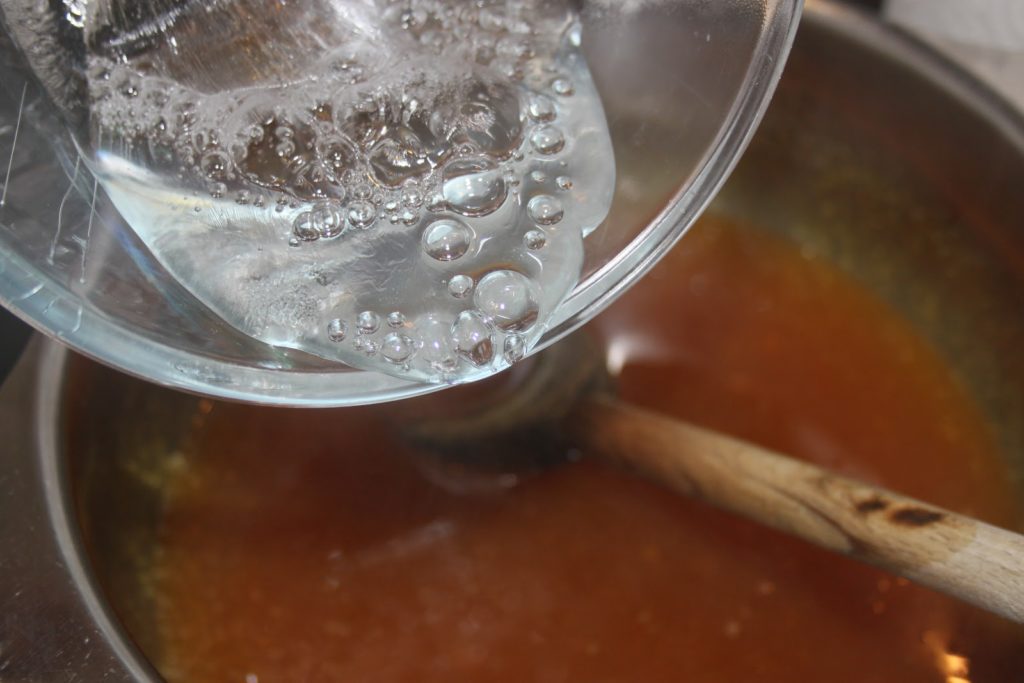 - Ajouter également le sirop de glucose. Note de Bernard: pour le verser facilement, on peut le réchauffer 30 secondes au micro-onde ou bien au bain-marie. De cette façon il va devenir liquide.