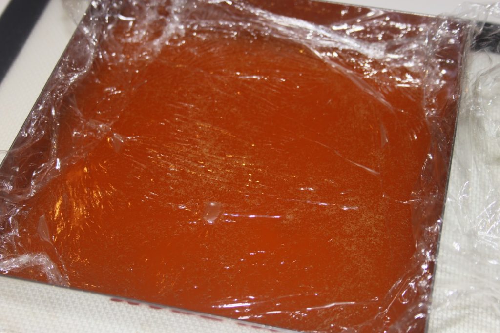 - Verser dans un cadre de 18X18cm posé sur un tapis silicone. Pas d’inquiétude, le tout restera bien étanche et le liquide ne sortira pas sous le cadre…
