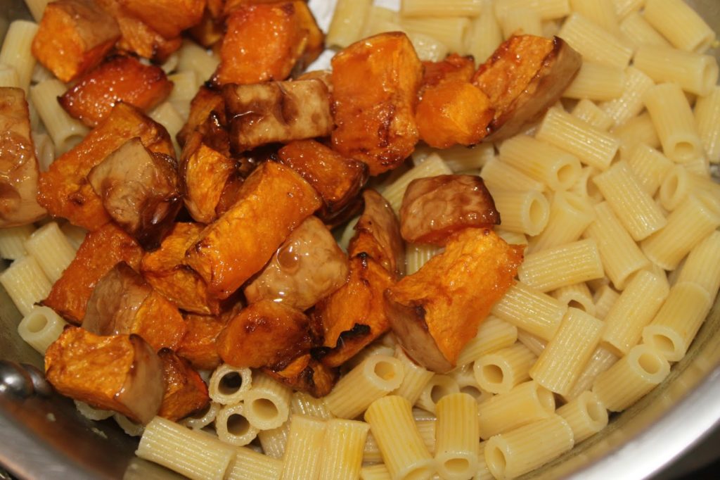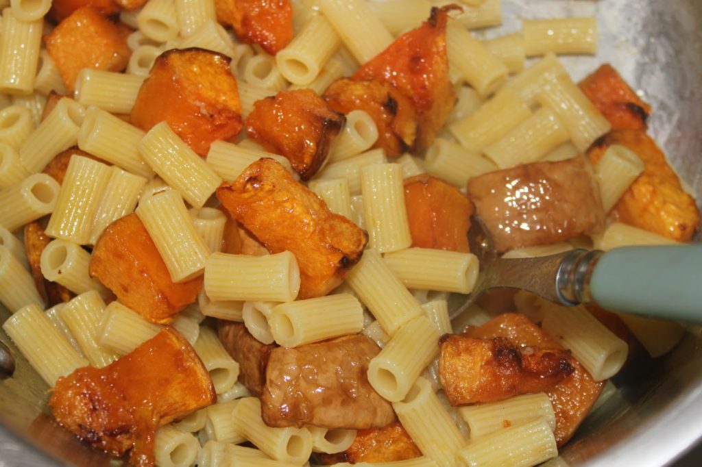 Égouttez les pâtes et ajoutez les morceaux de courge. Vous pouvez ajouter un peu d’olive d’huile du plat…