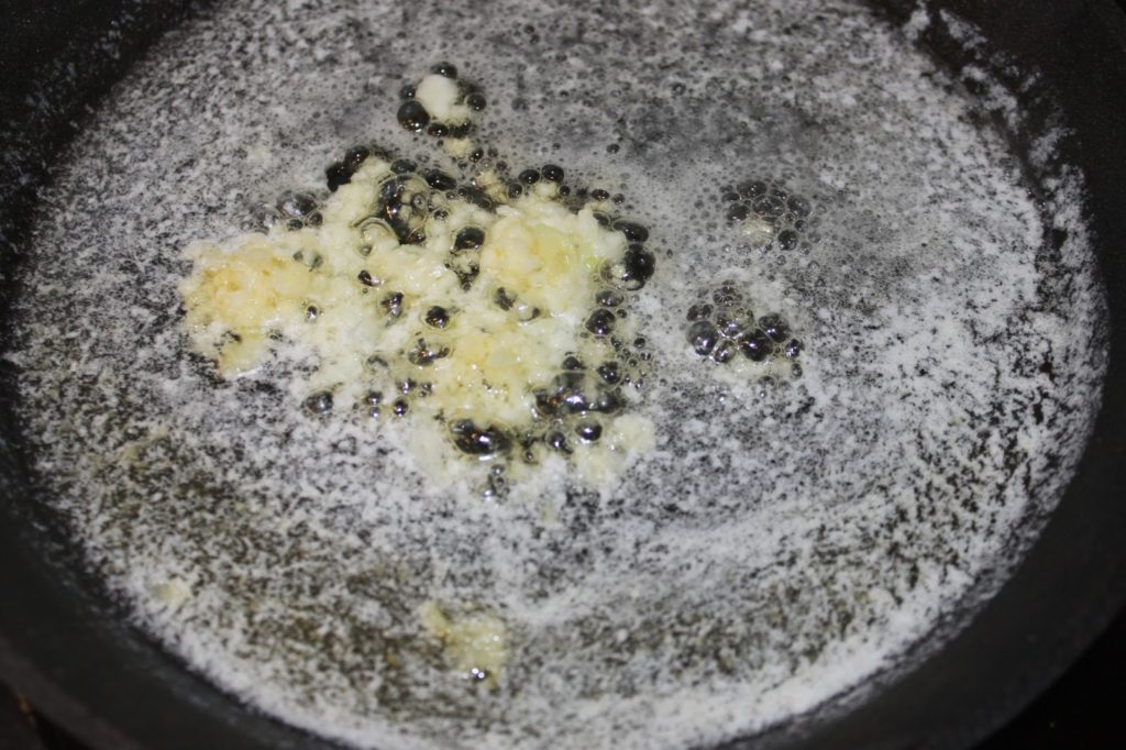 Faites chauffer sur feu modéré. Quand le beurre crépite et mousse, ajoutez les gousses d’ail écrasées.