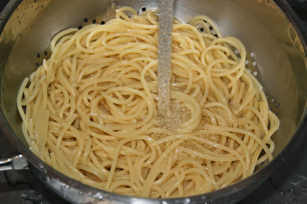 - Une fois cuites, gardez un peu d’eau de cuisson des pâtes puis rincez-les à l’eau froide.