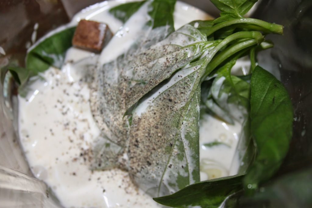 - Tout d’abord, mettez la crème liquide, le bouquet de basilic, sel poivre, deux cuillerées à soupe d’huile d’olive et le cube knorr dans un blender ou un petit mixeur.