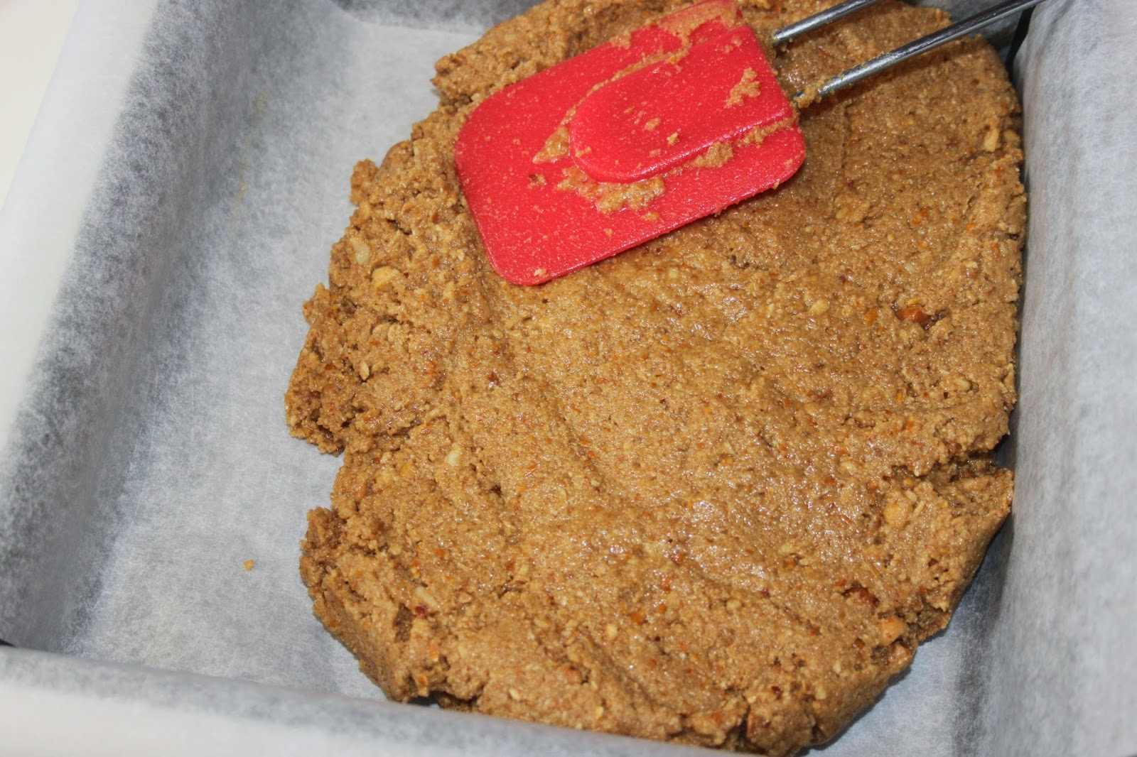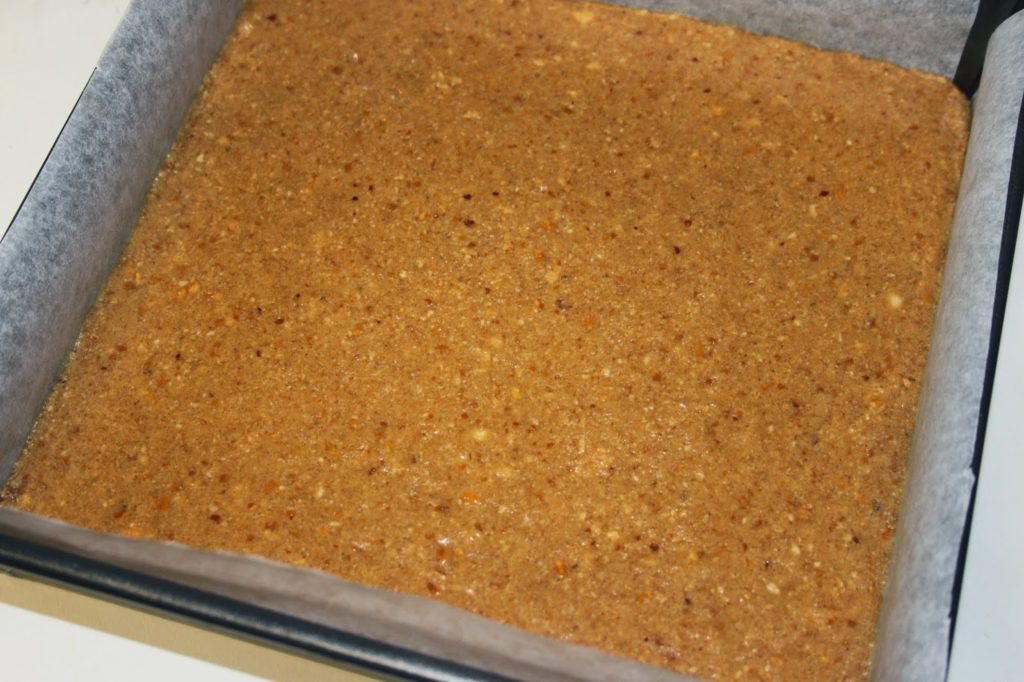 Mélangez soigneusement puis versez cette pâte dans un moule carré de 21cmX21 garni de papier sulfurisé.