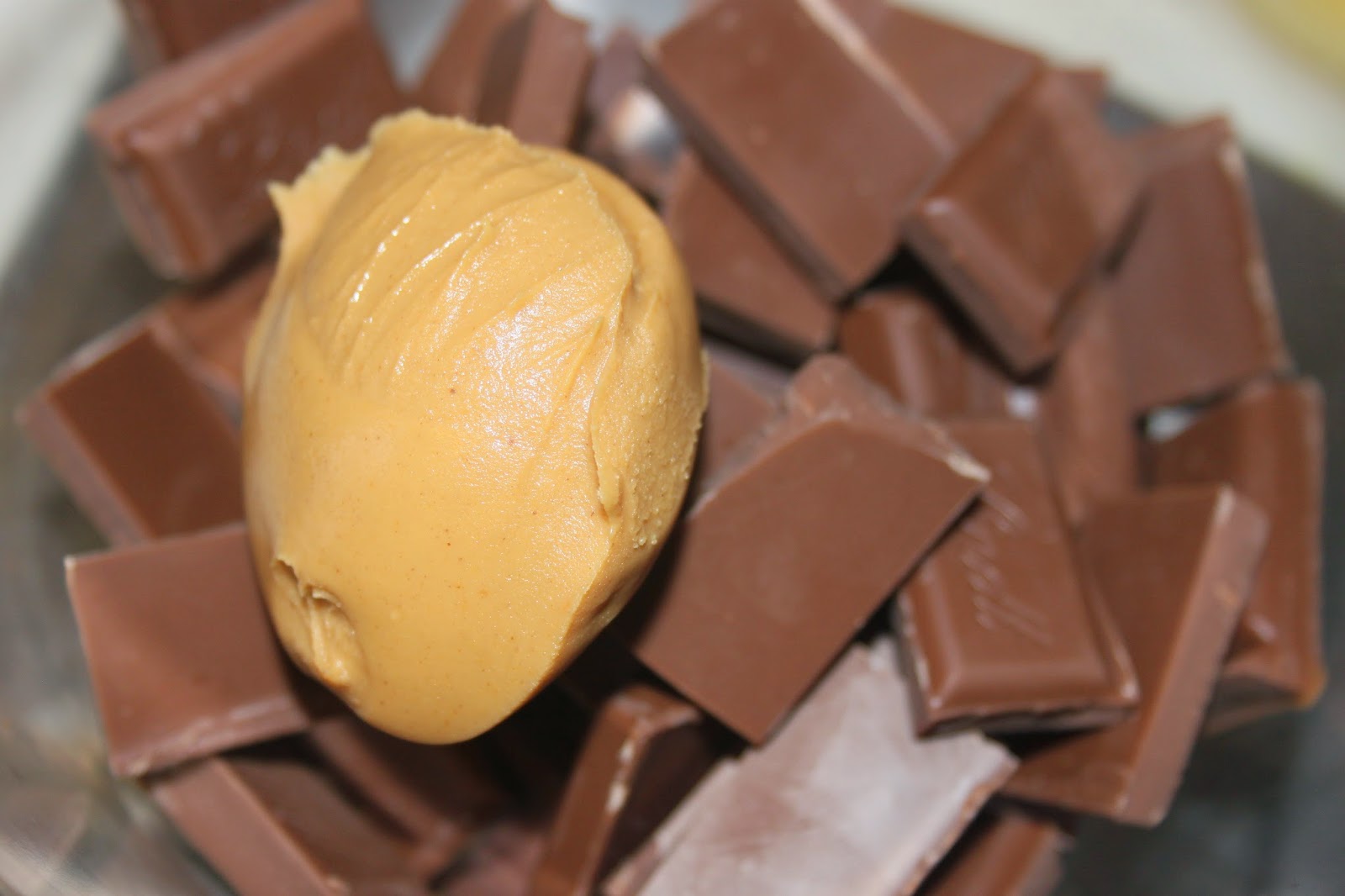 Faites fondre le chocolat au lait avec le beurre de cacahuètes lisse (au four à micro-ondes par 30 secondes ou au bain-marie).
