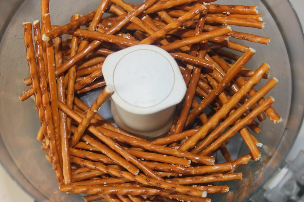 Mixez les bretzels apéritifs en une fine poudre. Cela peut être le format bretzel, là il s’agit des bâtonnets. J’ai utilisé la marque Ancel.
