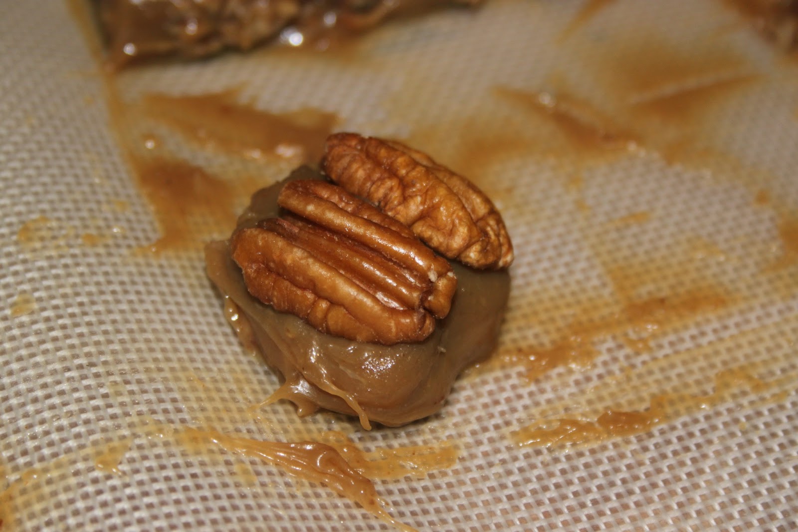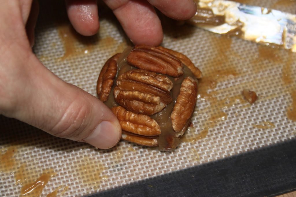 - Prendre un morceau carré de caramel puis poser 6 demi-noix de pécan comme sur les photos.