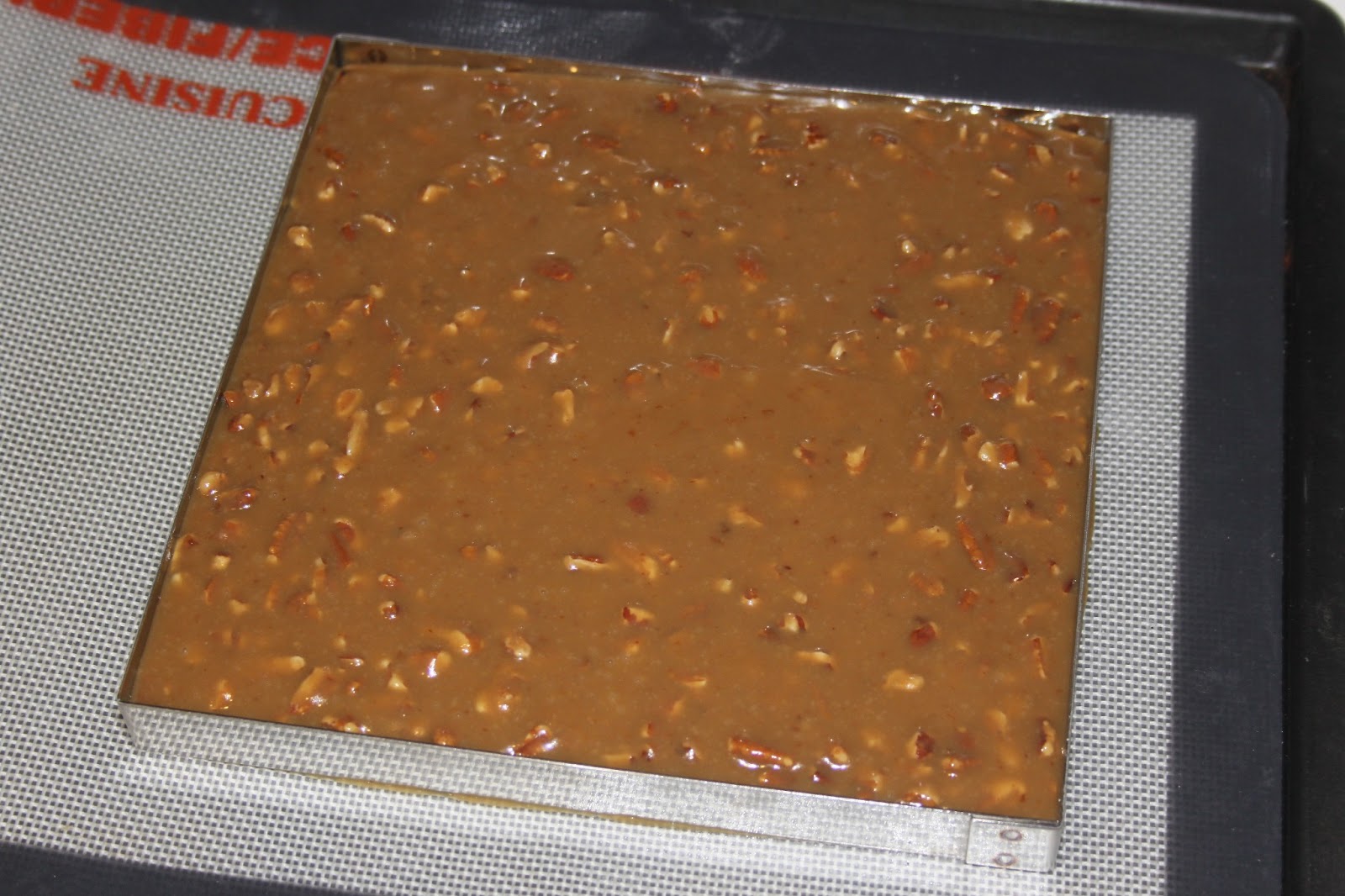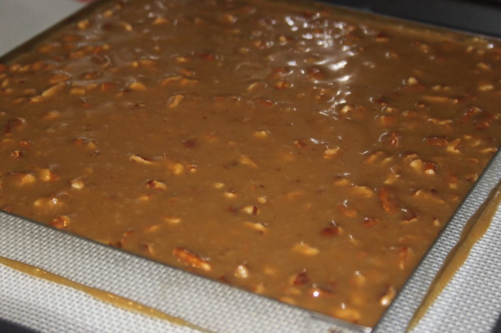 - Verser dans un cadre de 18X18 posé sur un papier sulfurisé ou un tapis en silicone de cuisson.