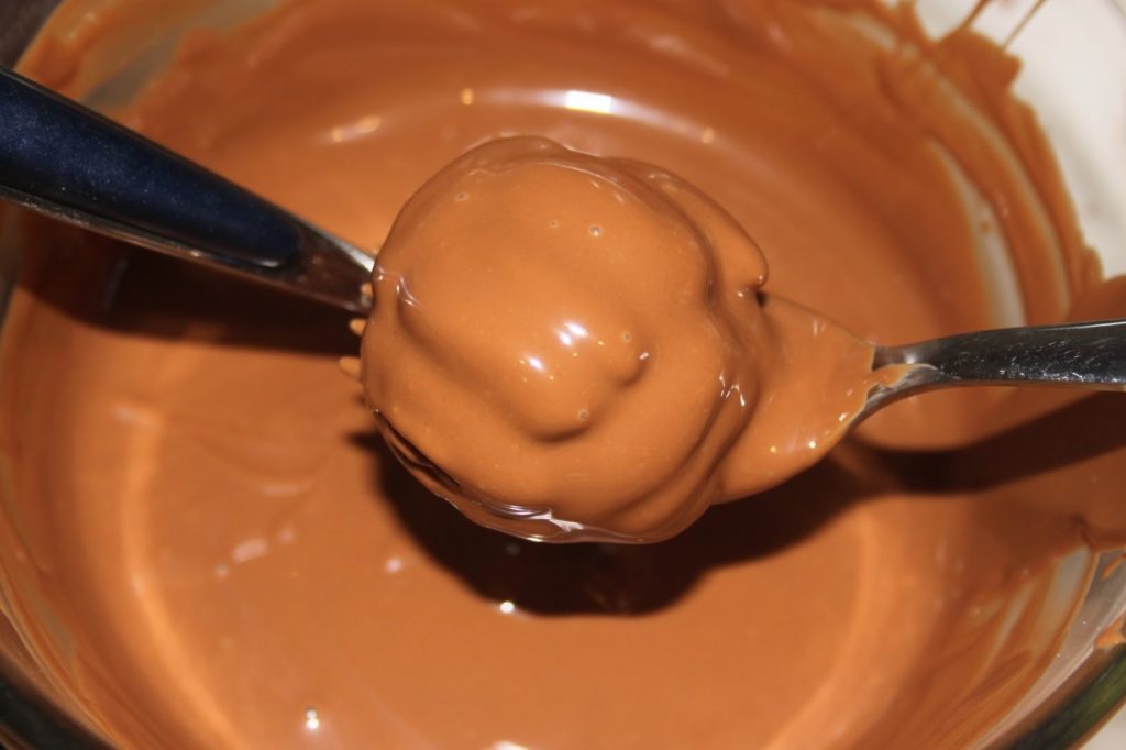 Faire de même avec tout le caramel. Mettre ensuite les caramel au congélateur pendant 2 heures afin de pouvoir le mettre dans le chocolat très facilement. Cela évitera au caramel de couler lors de sa plongée sous-chocolatière…
