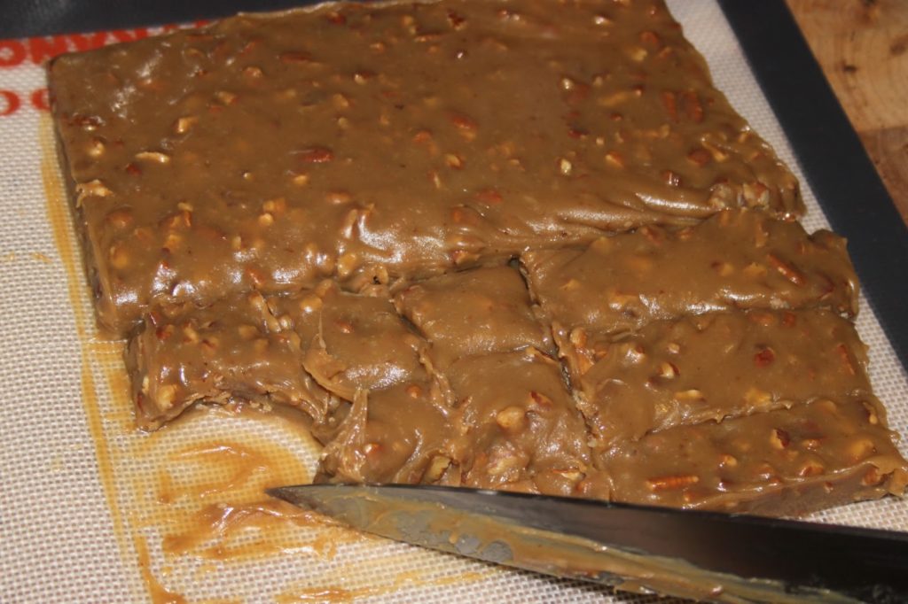 - Essayer de couper des gros carrés de 3cm sur 3cm. Le caramel est très mou à ce stade. Il doit donc être assez froid pour faciliter cette opération. Bien sûr on peut le manger déjà tel quel !