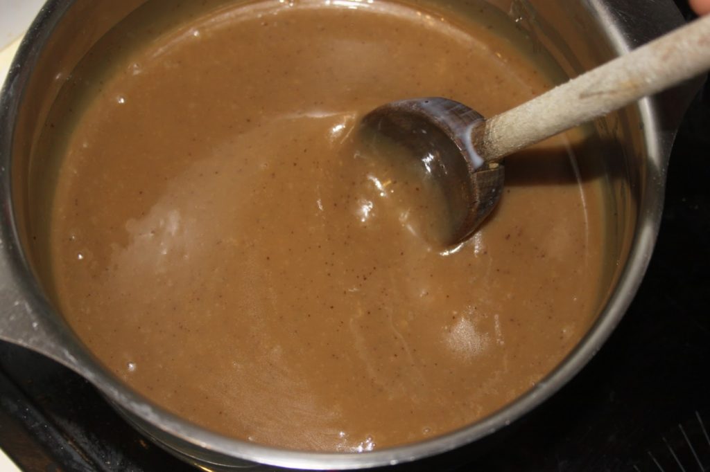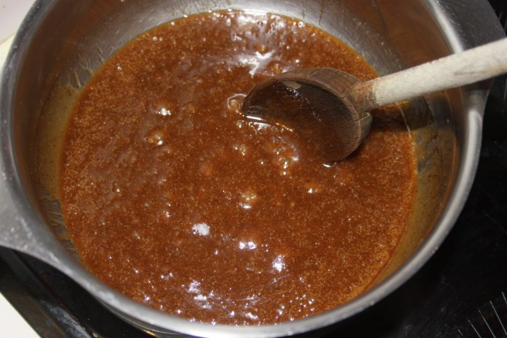 Mettre la vergeoise brune, le miel, le sel, la vanille liquide et le beurre dans une casserole sur feu modéré.