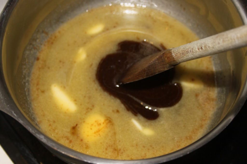 - Mettre la vergeoise brune, le miel, le sel, la vanille liquide et le beurre dans une casserole sur feu modéré.