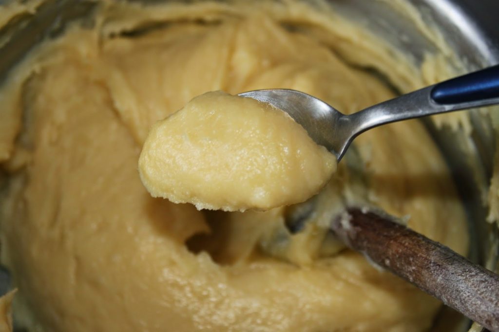- Ajoutez les 150ml d’œufs battus petit à petit sur la pâte. Mélangez bien avant d’ajouter le reste des œufs.