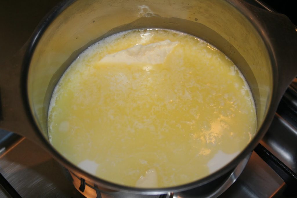 - Réservez cette purée et préparez la pâte à choux. Mettez le lait, l’eau, le beurre demi-sel et le sel dans une casserole.