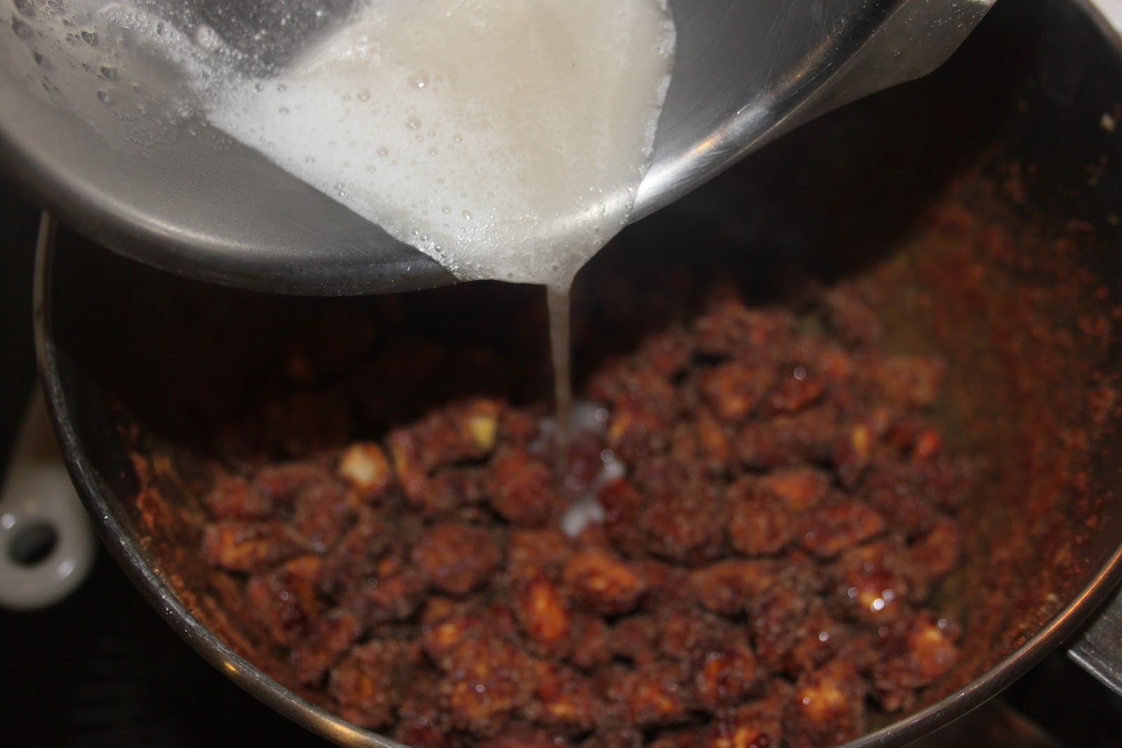 - Quand tout le sirop est versé et que les cacahuètes sont recouvertes de sucre, mettre les cacahuètes dans une poêle bien chaude (la même que tout à l’heure!) et laisser caraméliser très légèrement. Il ne faut surtout pas que le sucre refonde, mais que simplement une petite couche en surface fonde. Cette opération n’est pas forcément très traditionnelle, mais je trouve que les pralines sont meilleures ainsi.