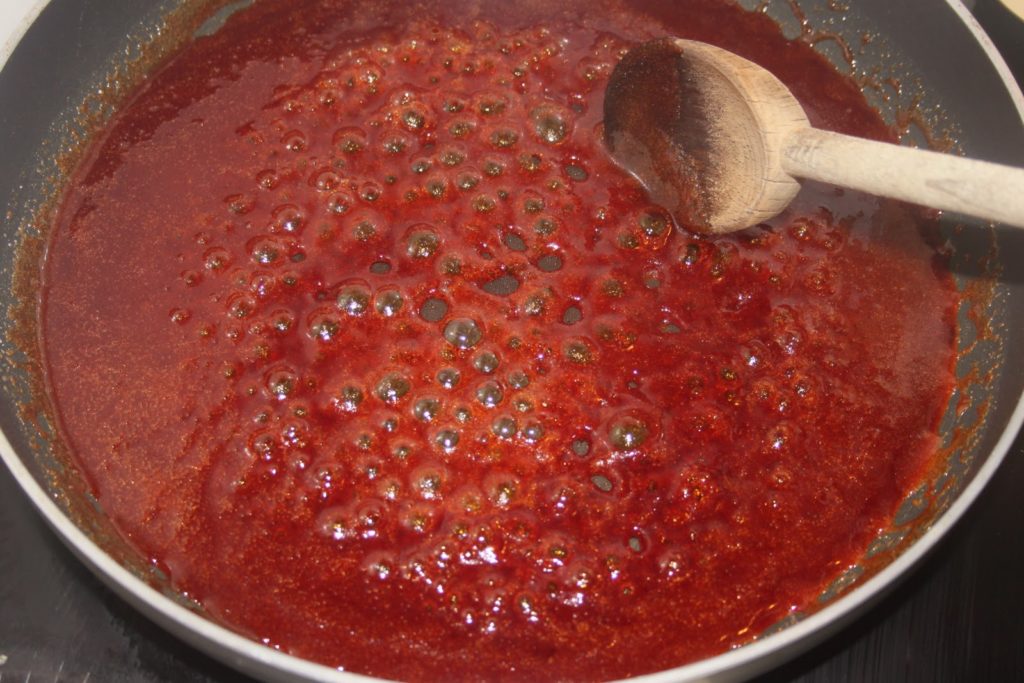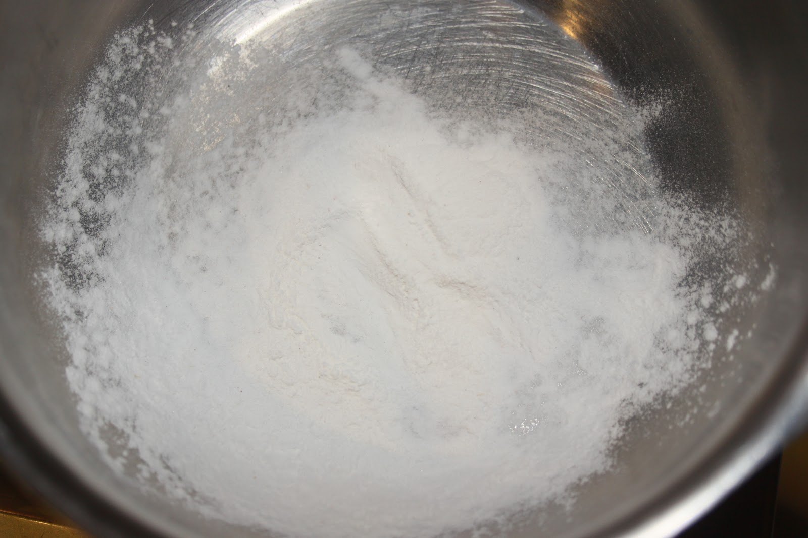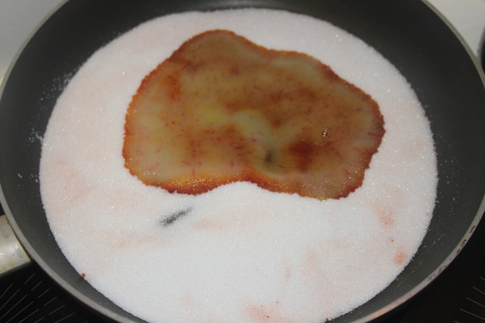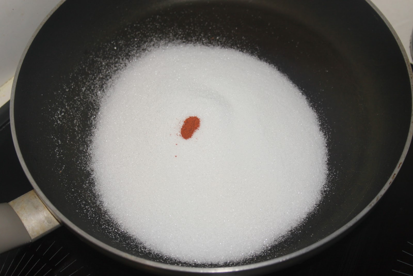 - Diviser le sucre en trois portions égales. Mettre 330g de sucre dans un poêle avec une bonne pointe de couteau de colorant.