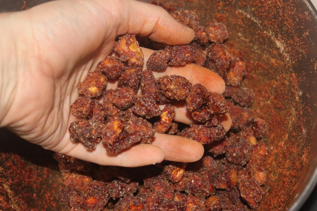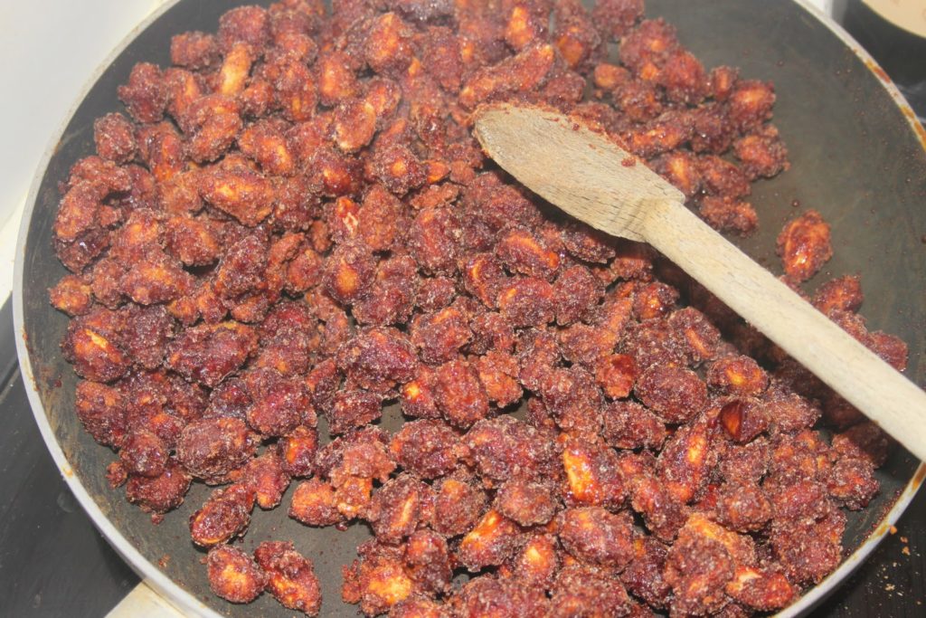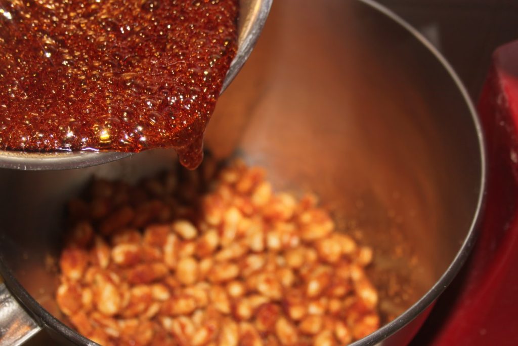 - Le sucre va cristalliser et le mélange sabler. Bien répartir le sucre sur la surface des cacahuètes.