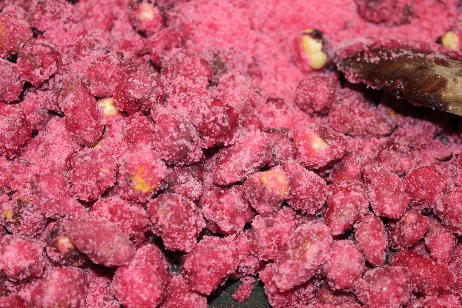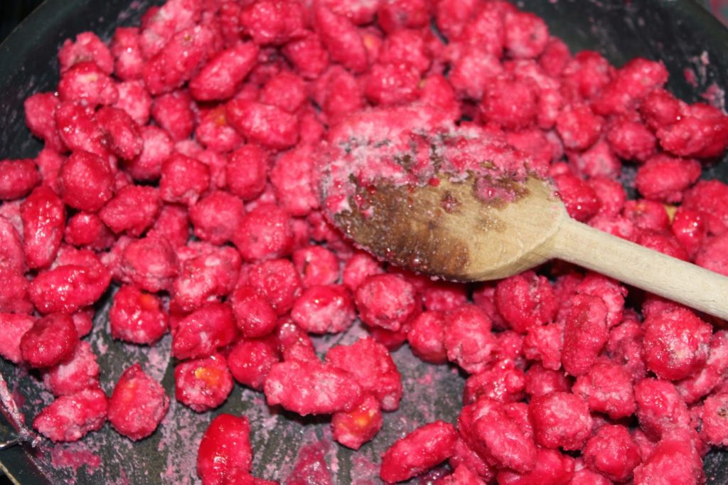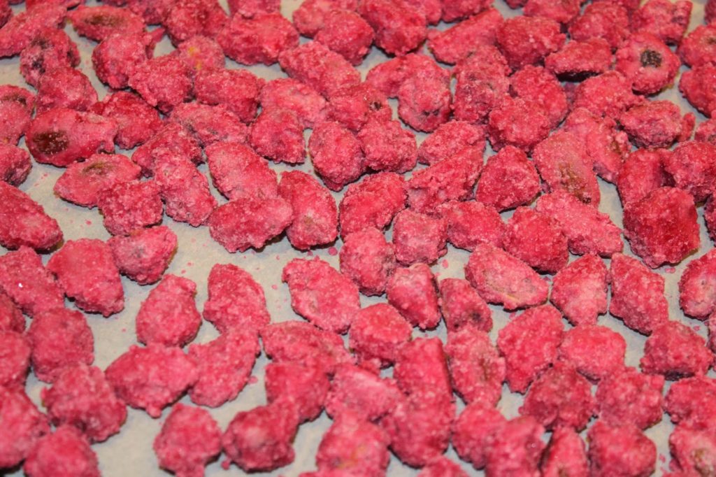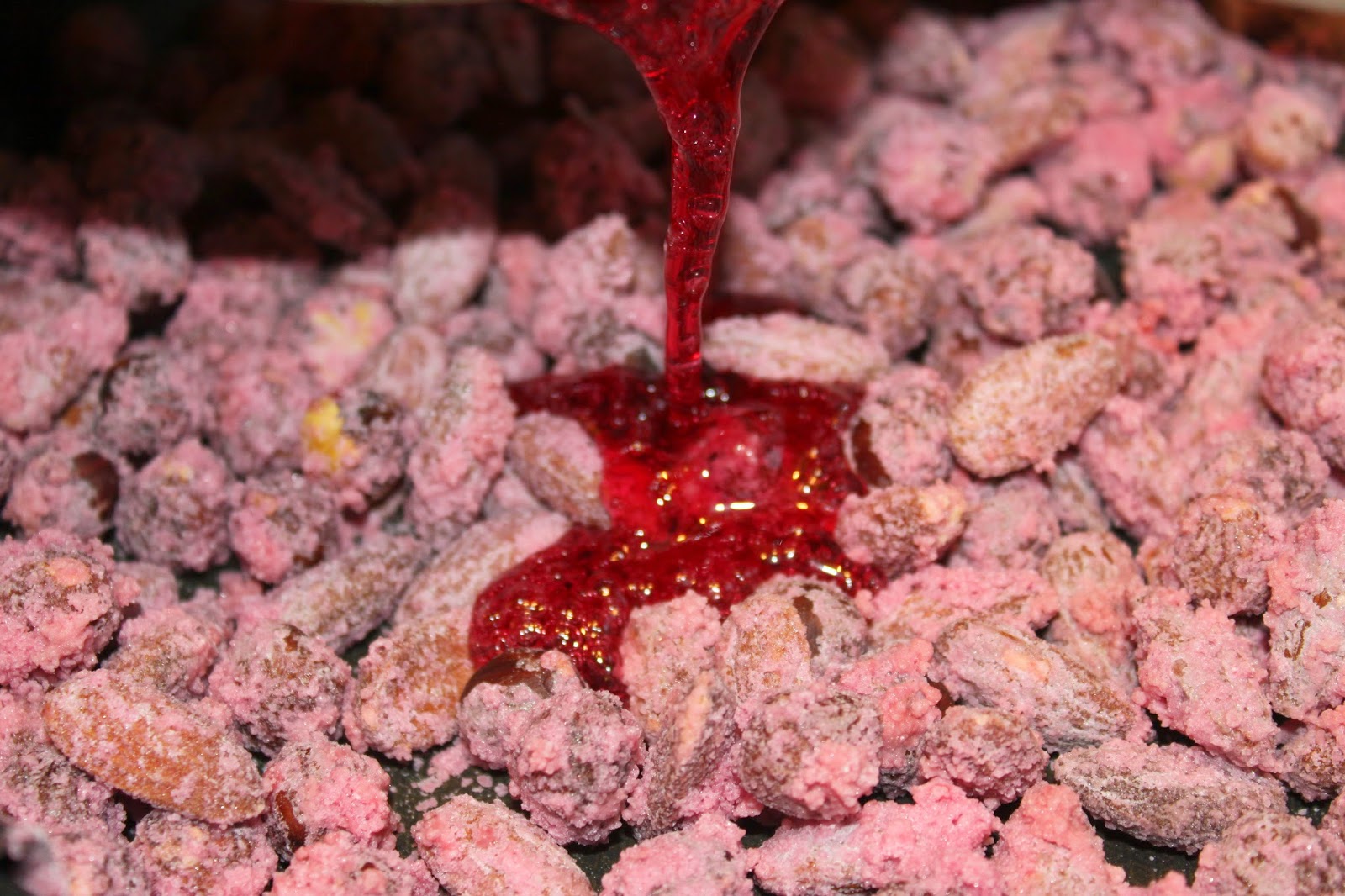 Avec cette 3ème opération, le sirop va cette fois bien enrober les pralines roses.