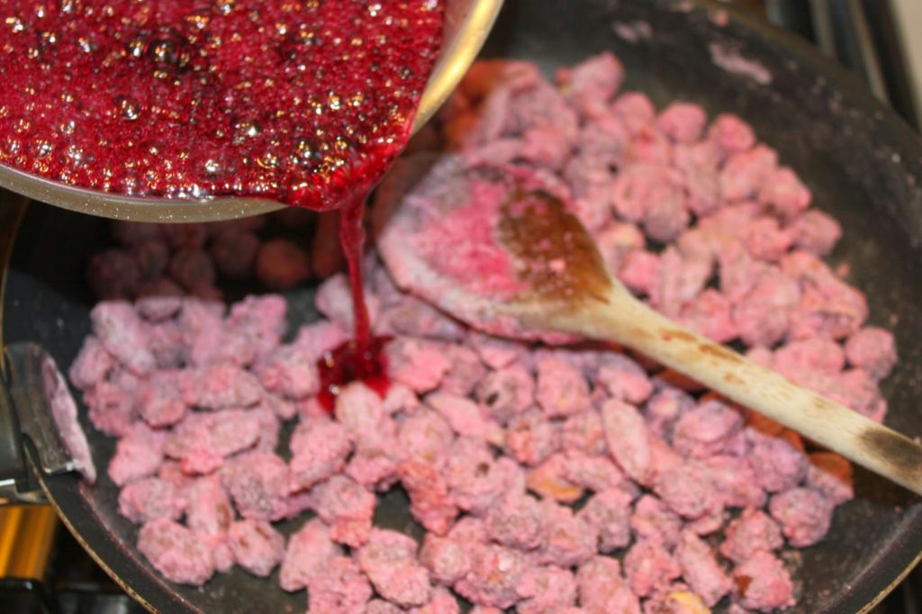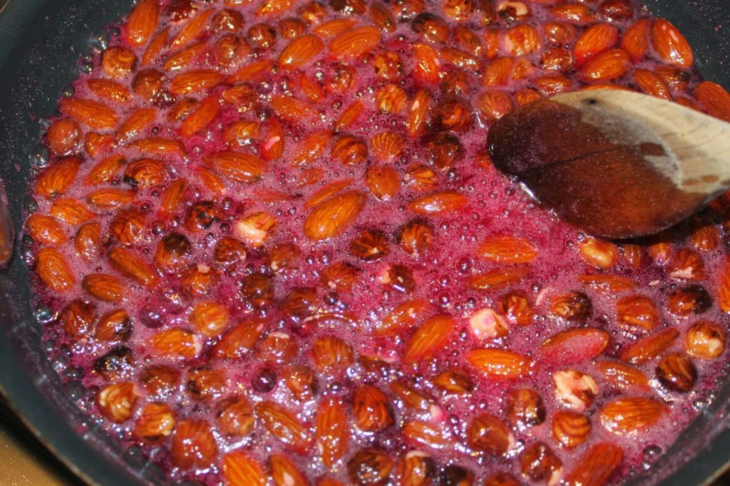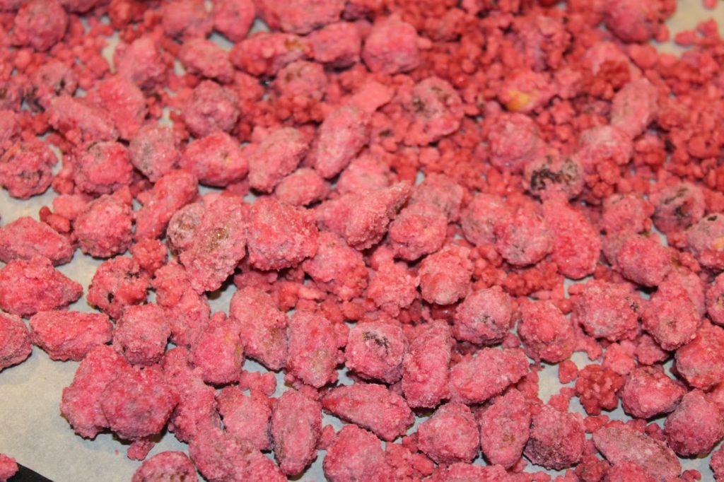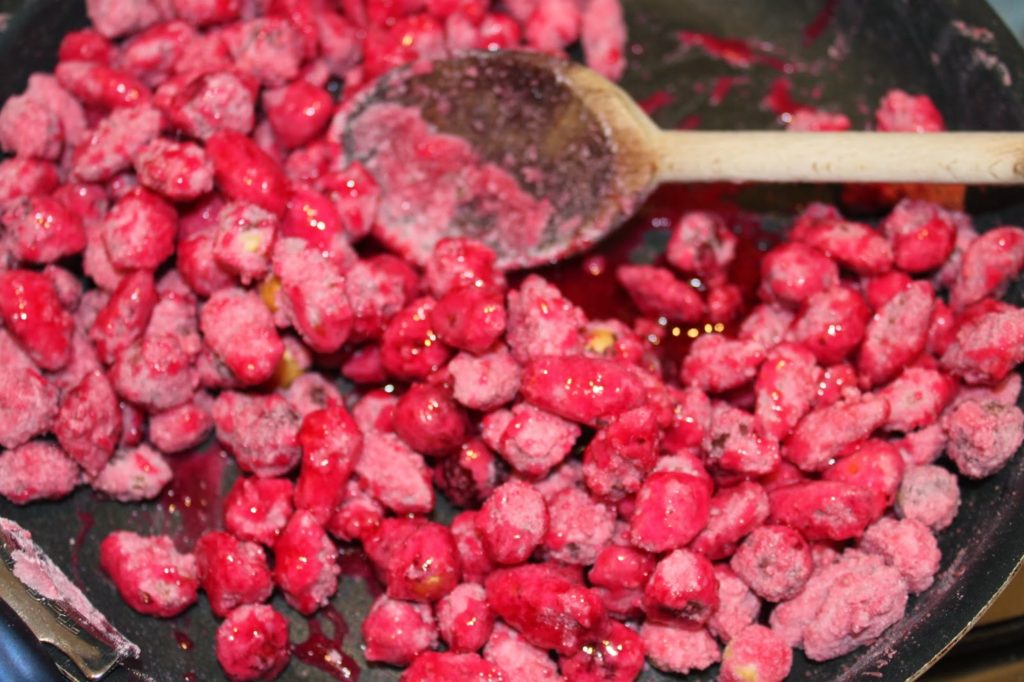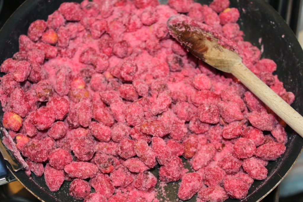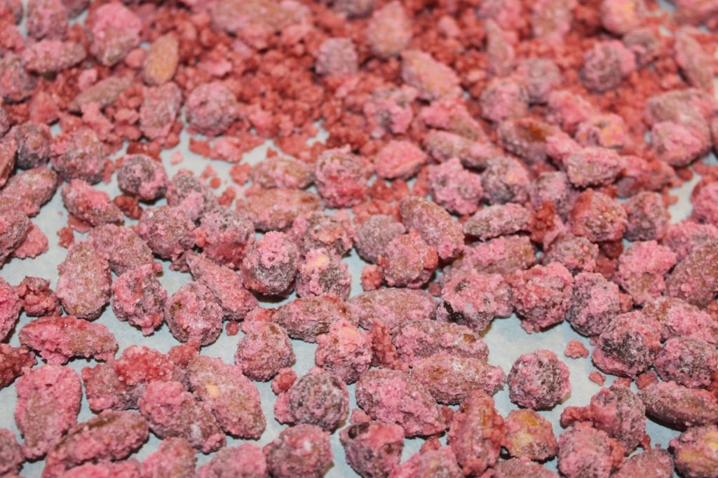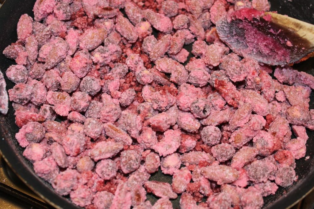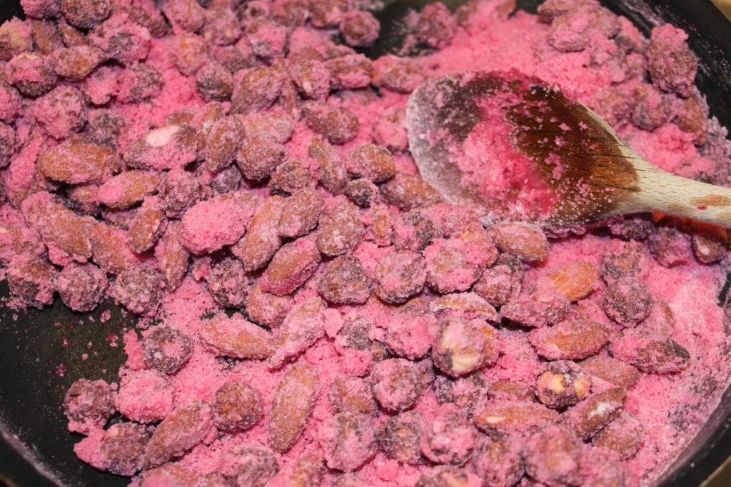 D’un côté vous aurez les fruits secs et de l’autre du sucre qui ne veut pas coller, il y a comme du sucre en poudre rose. Laissez-le fondre partiellement pour qu’il adhère aux noisettes et amandes.