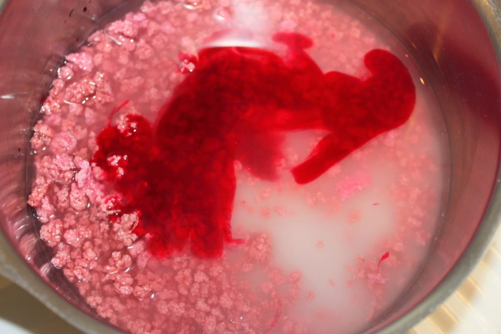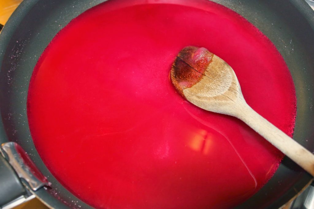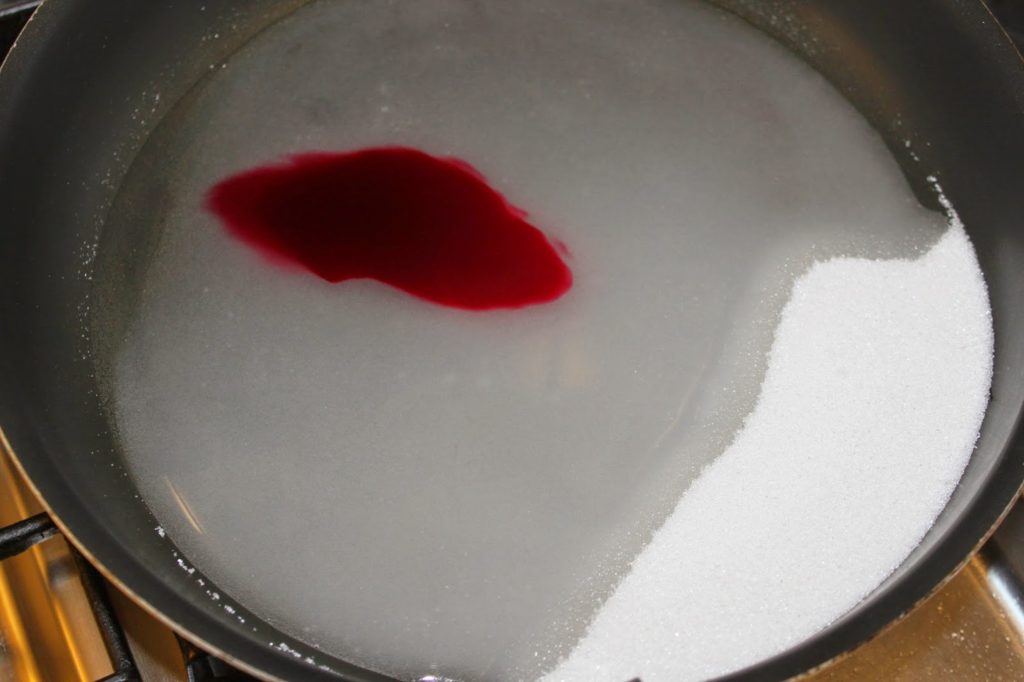 Ajoutez un peu de colorant rouge et de l’eau. Portez à frémissement sur feu doux jusqu’à ce que les morceaux de sucre soient tous bien fondus.