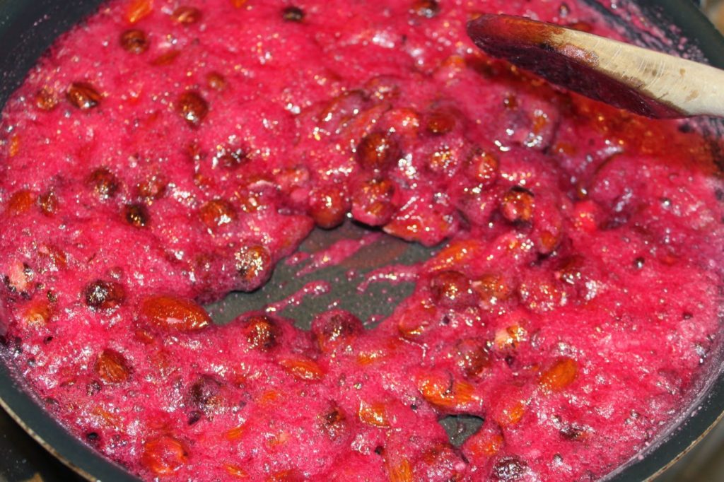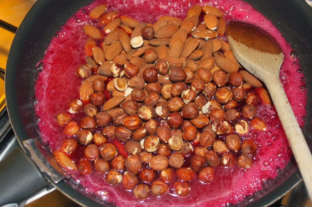 Remettez les fruits secs dans la poêle. N’allumez pas encore le feu sous celle-ci. Portez d’abord le sirop à ébullition jusqu’à 124°C.