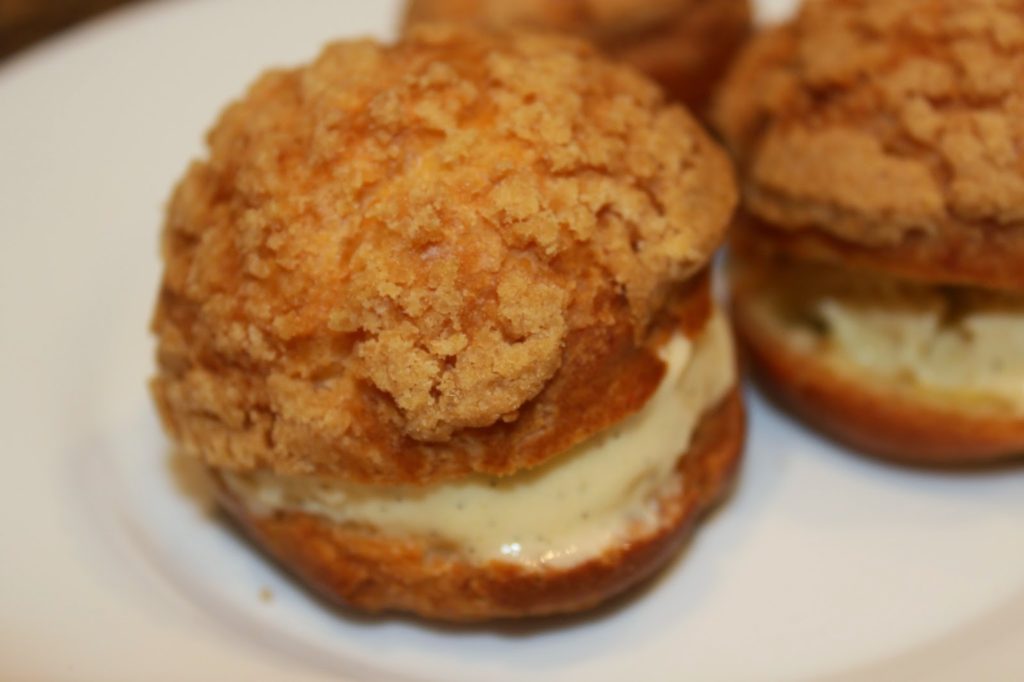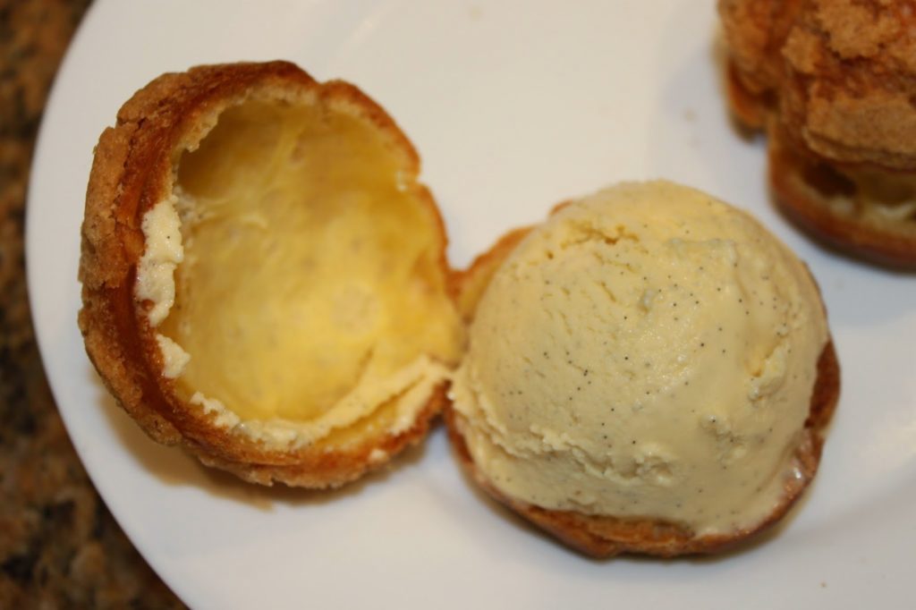 - Ouvrez vos choux en deux puis garnissez-les d’une boule de glace vanille. Je l’ai préparée maison avec la recette que je vous donne LÀ.