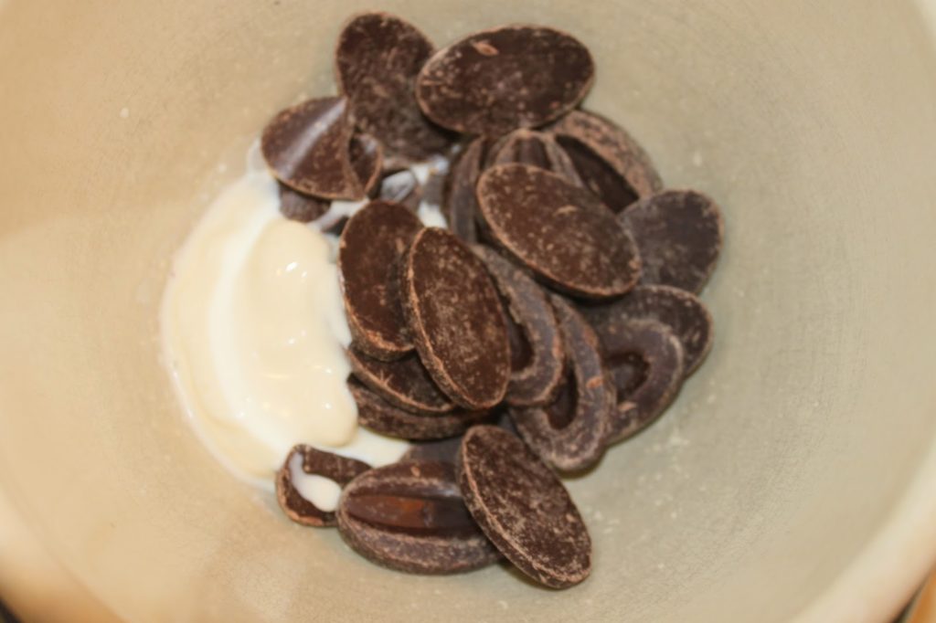 - Mettez le chocolat noir avec la crème liquide entière au four à micro-ondes pour 1 minute ou au bain-marie.