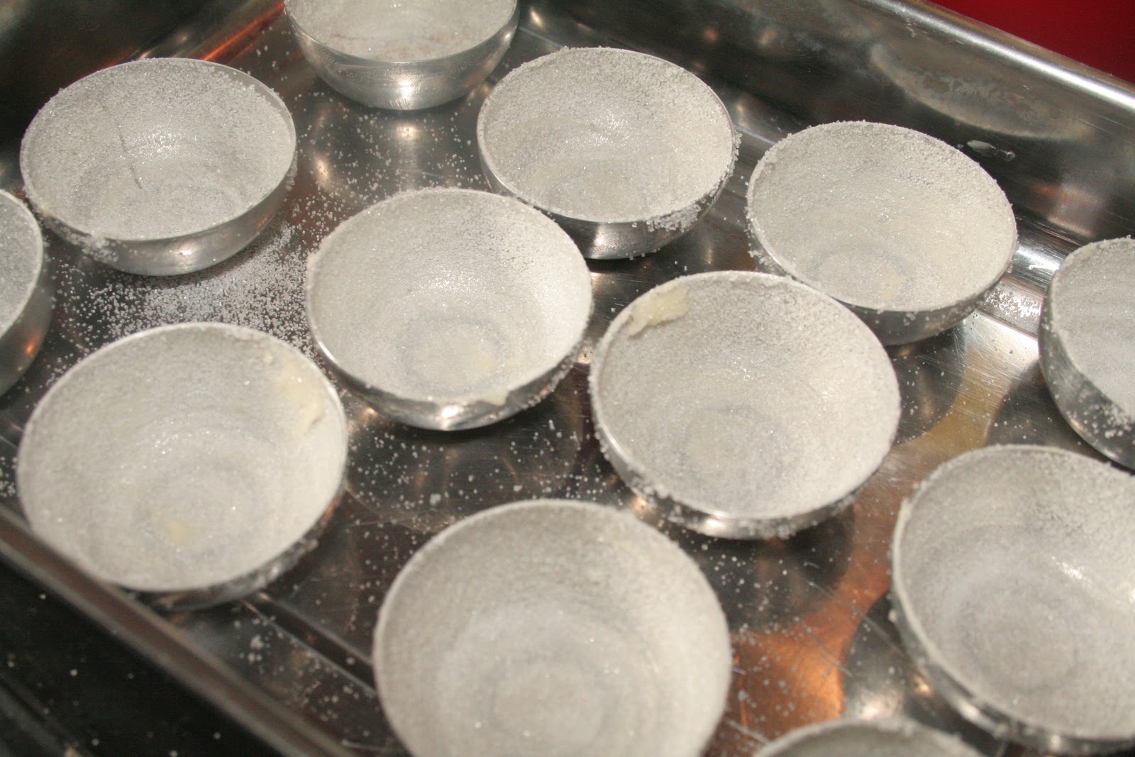 Puis les sucrer. C’est le fait de beurrer et de sucrer qui va assurer le démoulage des quindins, alors même que nous utilisons des moules en aluminium.