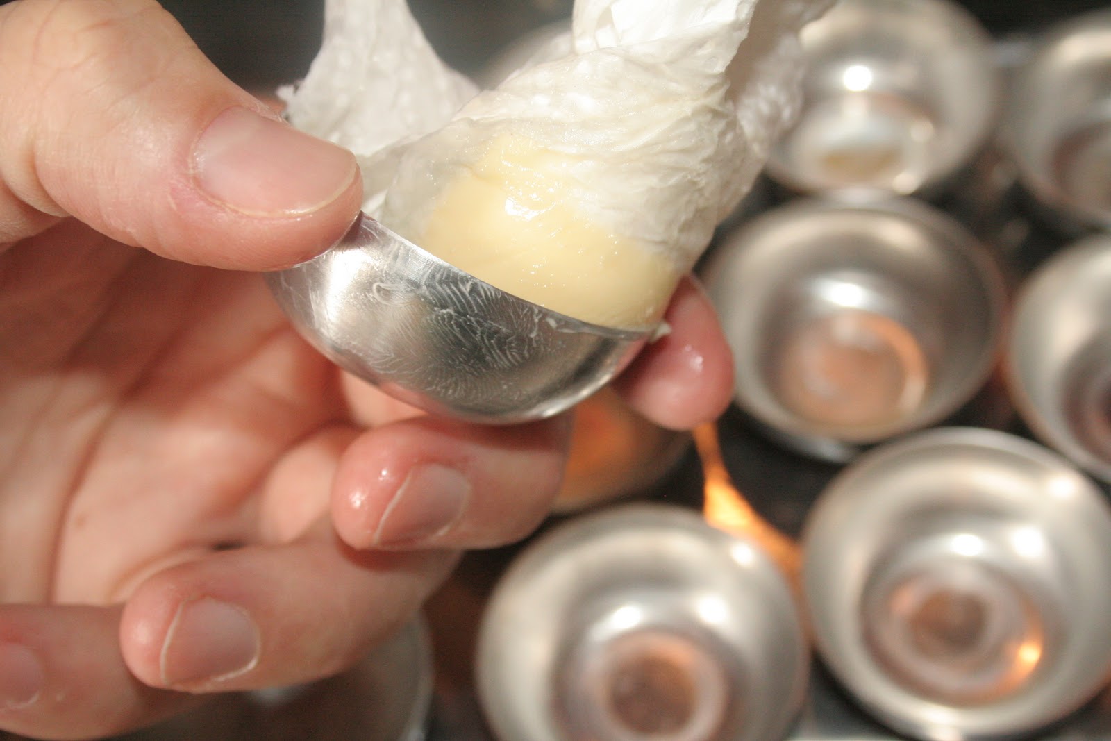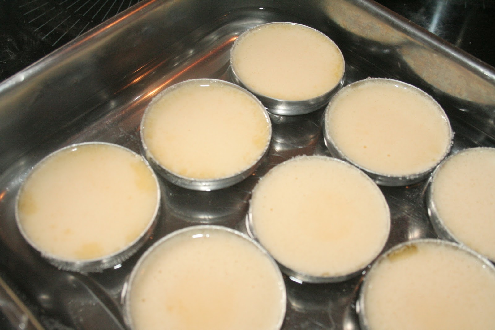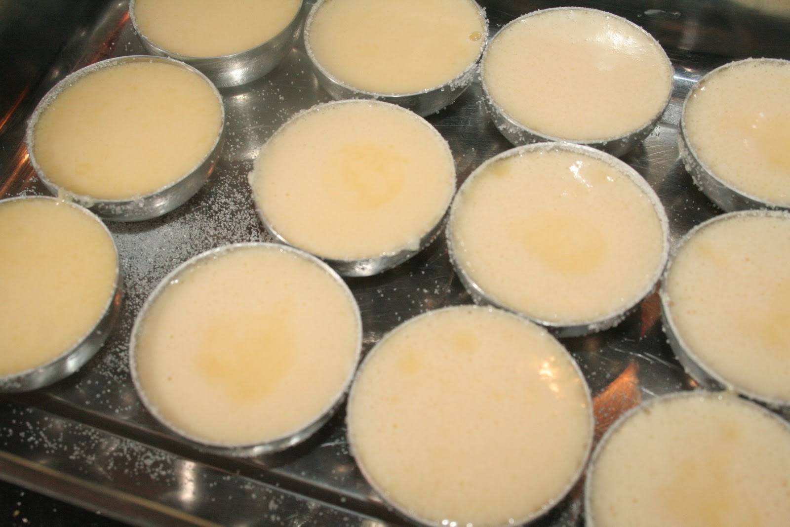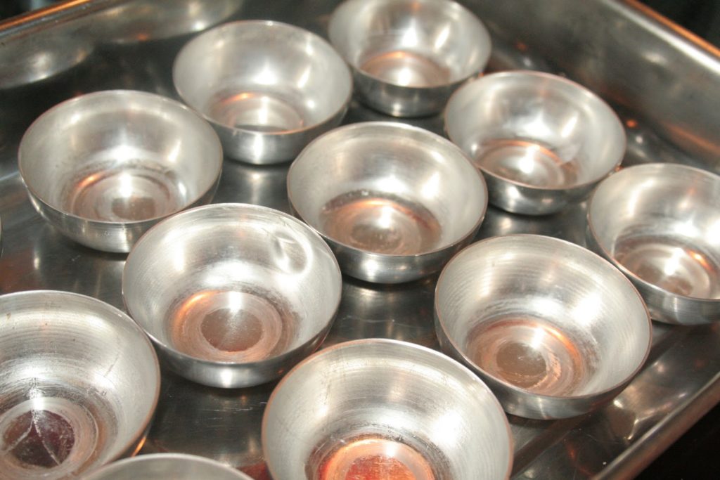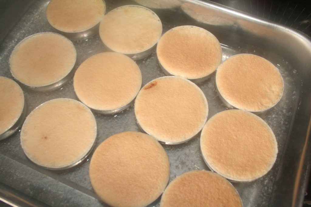 Voici les moules à quindins N°1. Il y en a de plusieurs tailles. Mettre les moules dans un plat allant au four.