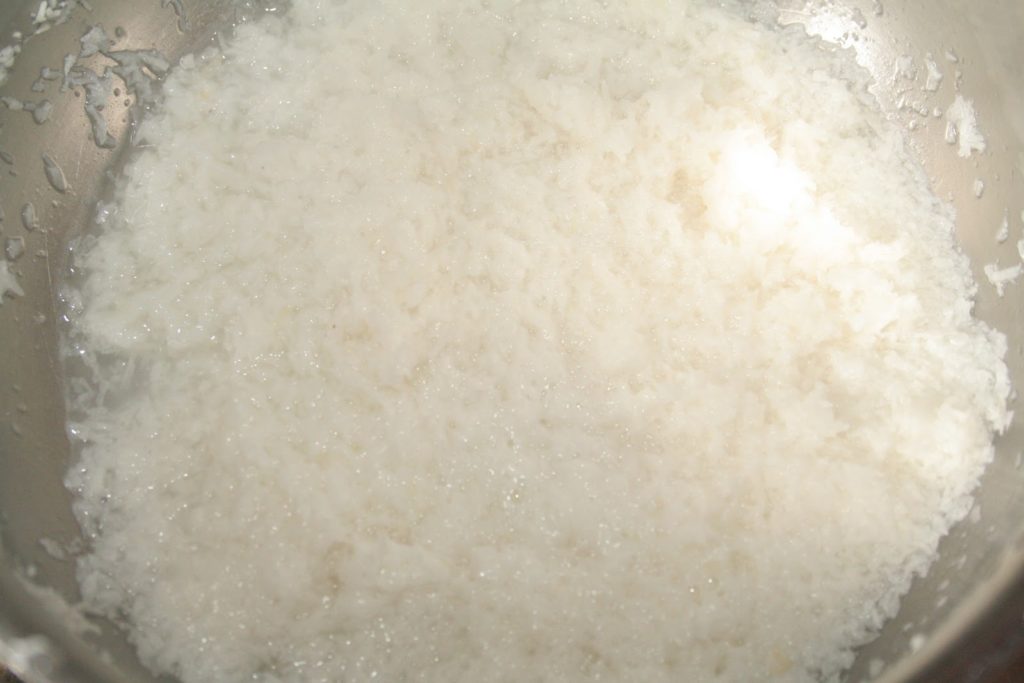 - Préchauffer le four à 180°C.Mettre à tremper la noix de coco séchée râpée dans 200g d’eau tiède.