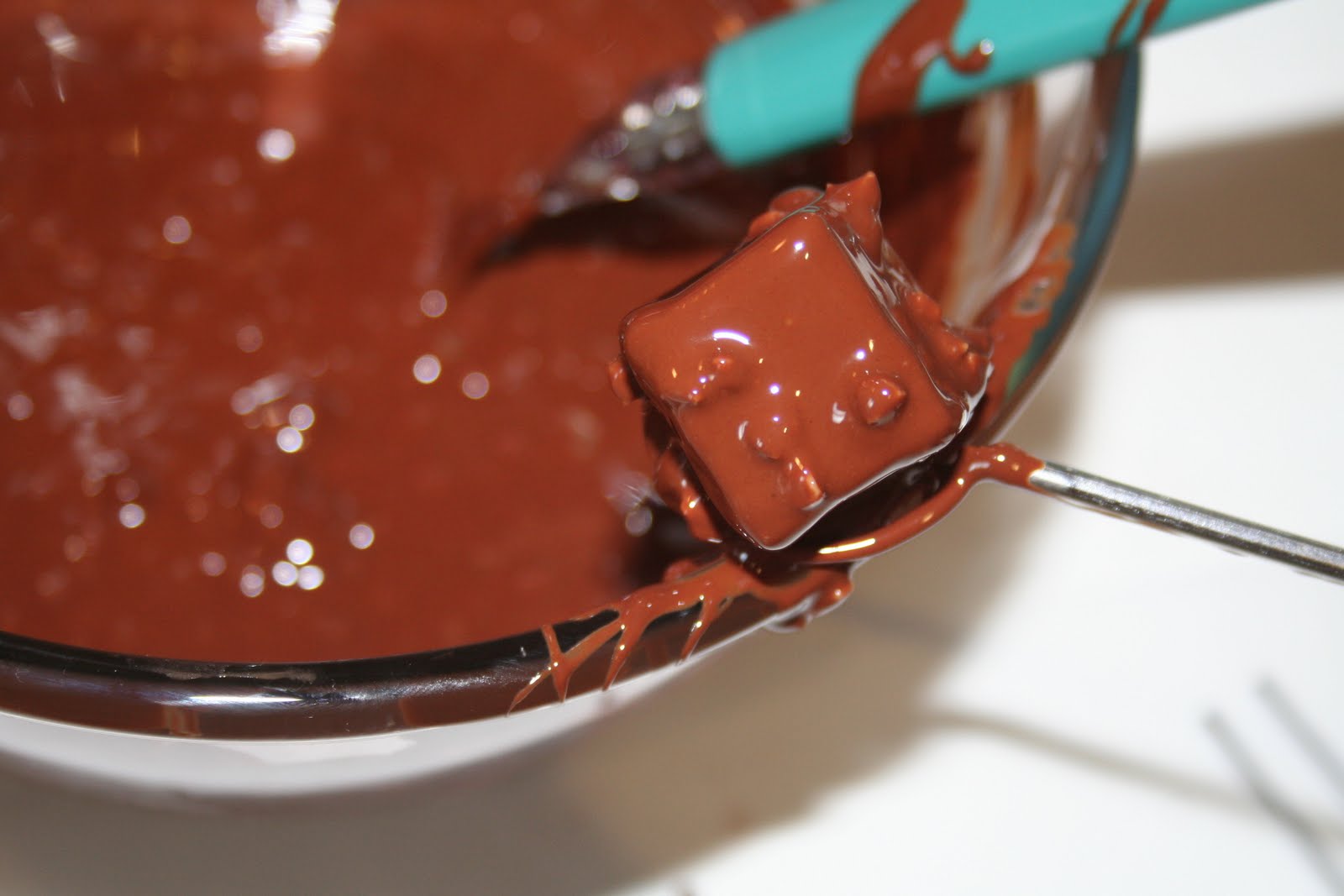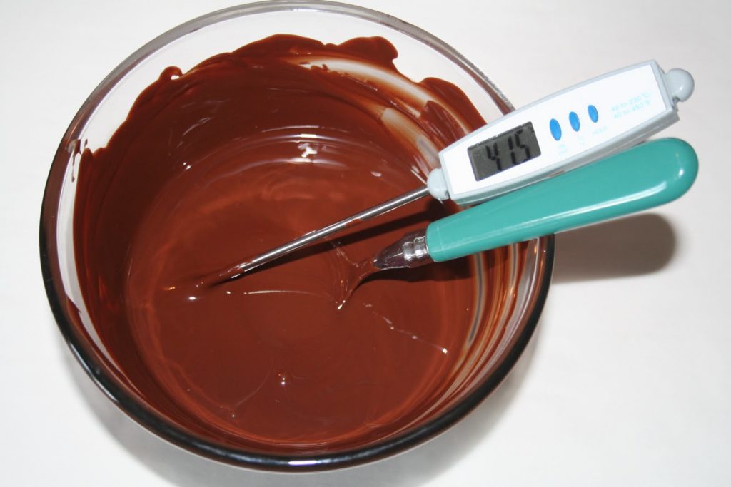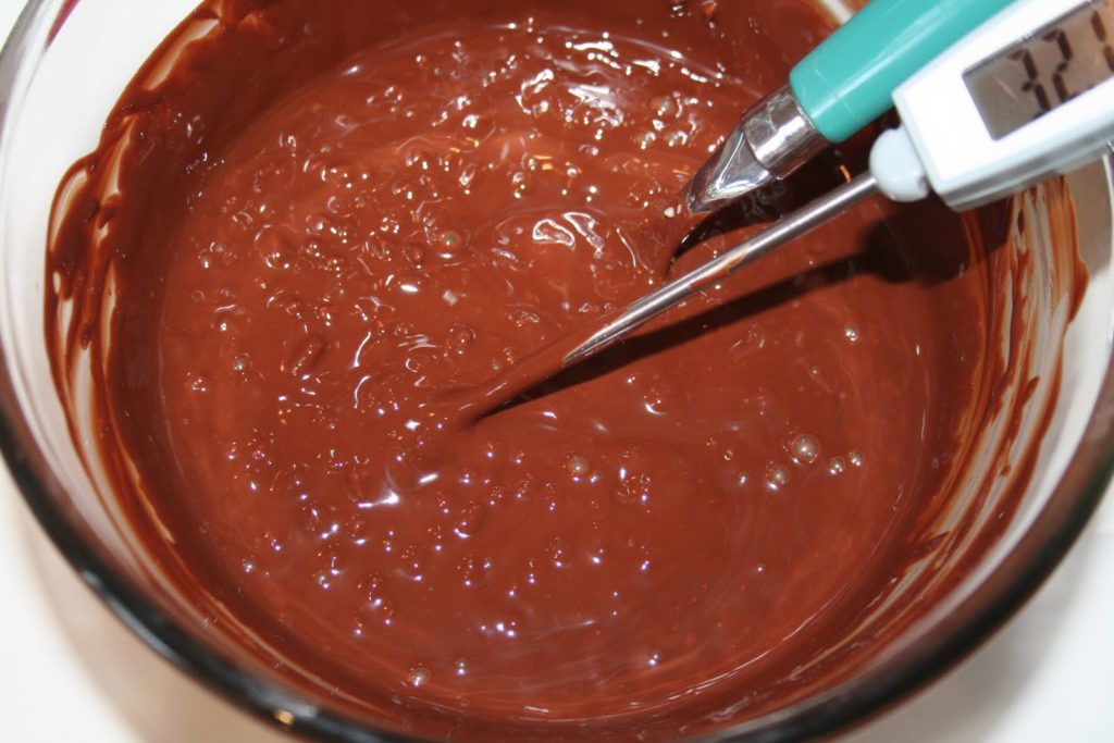 - Fondre la couverture d'enrobage à 40-45°C en suivant la méthode du chocolat tempéré.