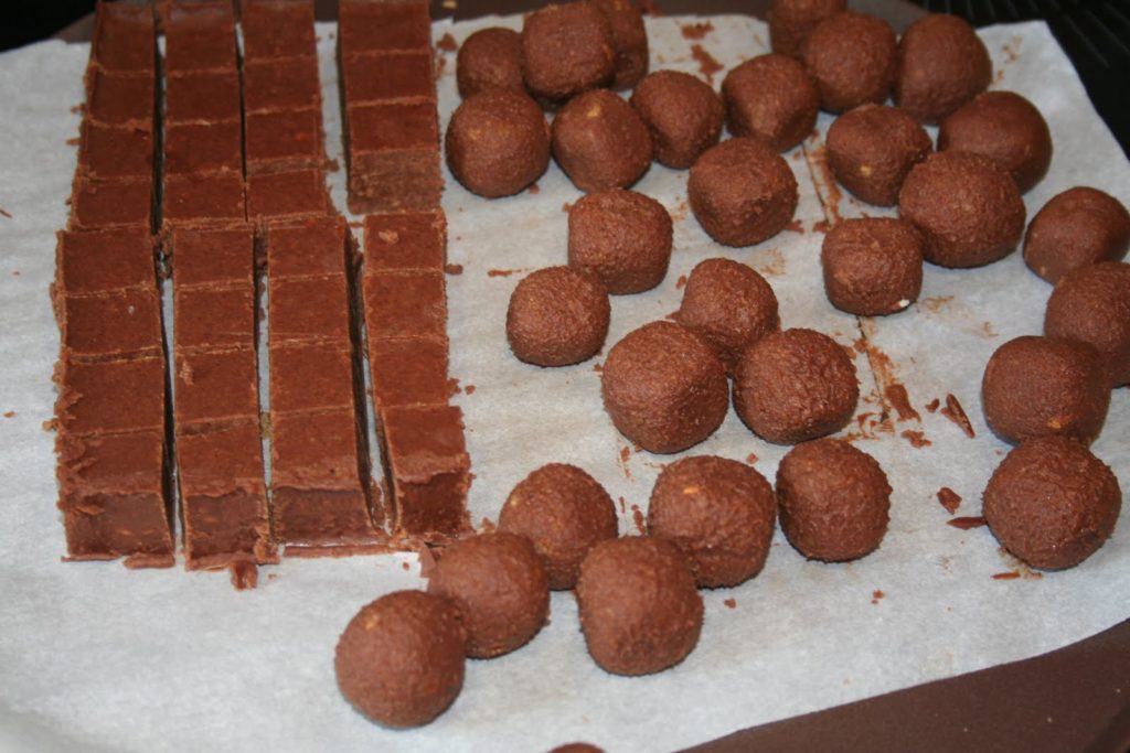 Couper en 64 parts égales. Je n’étais pas satisfait des cubes, j’ai donc roulé les cubes à la main pour en refaire des boules. Les professionnels utilisent une « guitare » pour couper parfaitement les ganaches, mais vu le prix exorbitant, je préfère cette méthode.