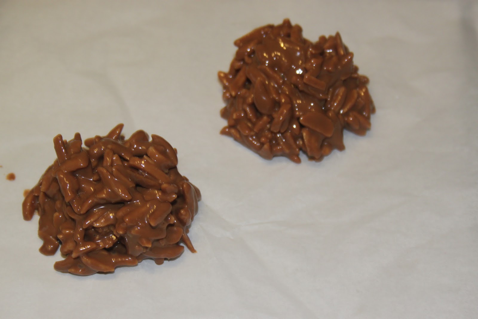 - Former des petits tas avec une cuiller à soupe sur un papier sulfurisé. Il faut y aller doucement car sinon le tas s’effondre. On peut aussi tout à fait les mettre dans des mini moules à muffins en silicone.