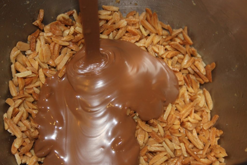 Toutes les 5 minutes, mélanger les amandes avec une cuiller. Au départ, il y a du sirop sous les amandes: pas de panique ! Le sirop va finir par s’évaporer et les amandes vont bien griller !