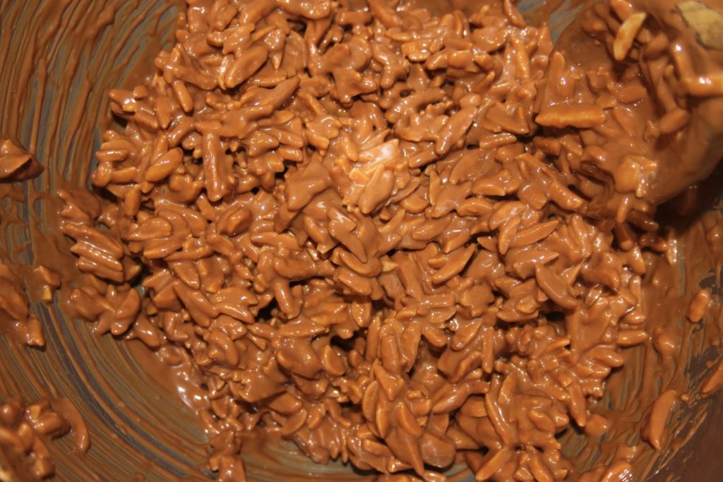 - Toutes les 5 minutes, mélanger les amandes avec une cuillère. Au départ, il y a du sirop sous les amandes: pas de panique ! Le sirop va finir par s’évaporer et les amandes vont bien griller !