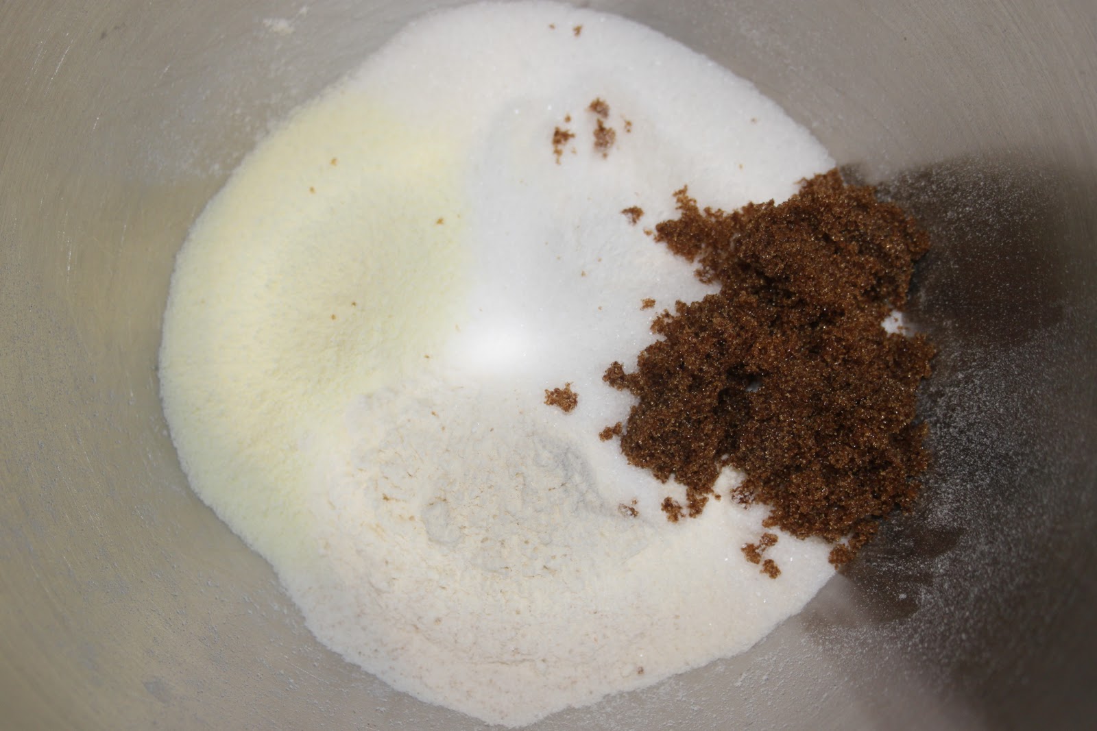 Mettre le sucre blanc, le sucre de canne (en magasin bio), la poudre de lait, la farine et la levure dans le bol d’un robot mélangeur.