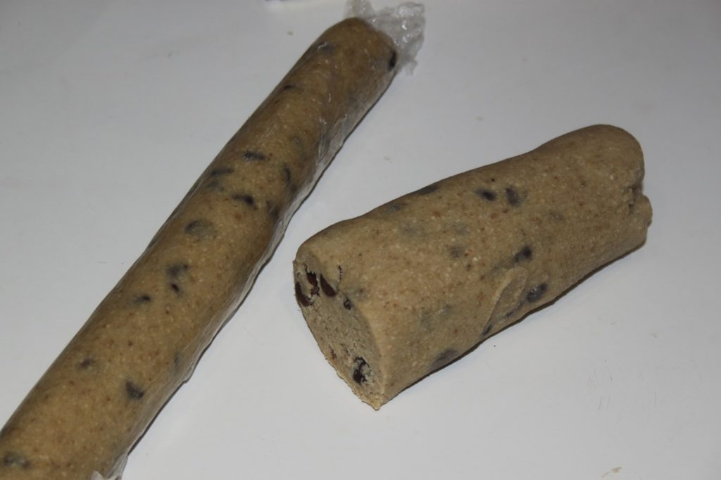 - Diviser la pâte en deux et mettre chaque moitié dans un film étirable en un boudin de 4cm de diamètre.