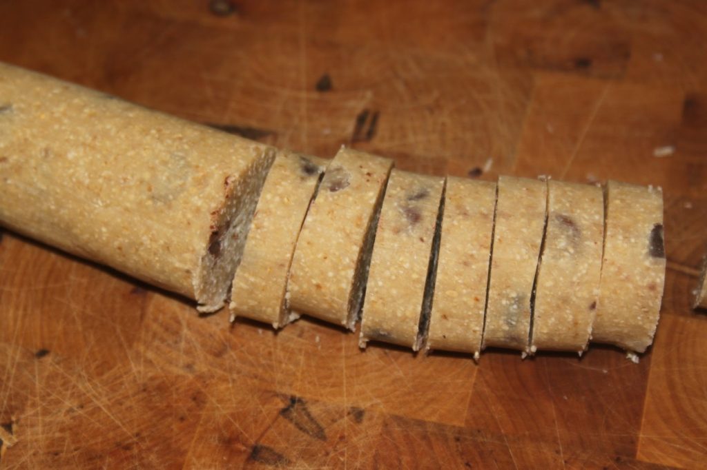 Laisser reposer au frais au moins deux heures pour saisir la pâte. Couper ensuite des tranches d’un centimètre d’épaisseur.