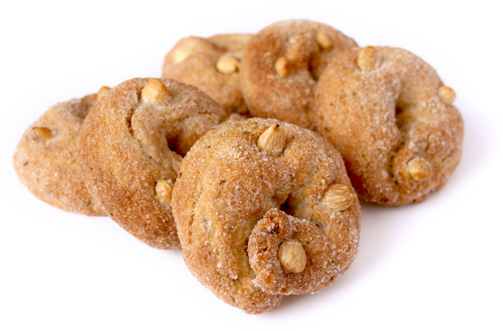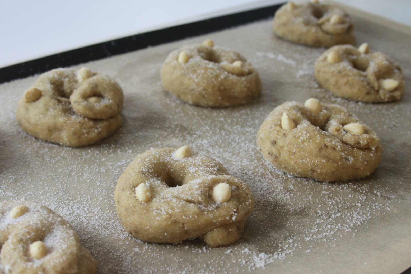 -420g de farine -10g de sucre -20g d’anis -15g de graines de sésame grillées -5g de cannelle -1 sachet de levure de boulanger (type francine) ou 20g de levure fraîche -150g d’huile d’olive -une trentaine d’amandes émondées -sucre en poudre