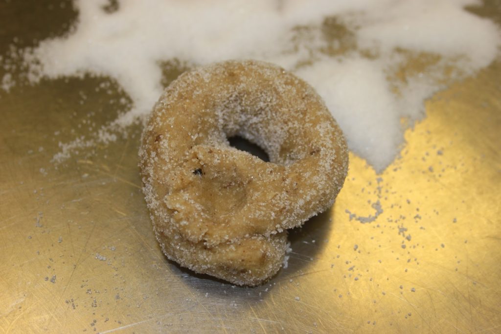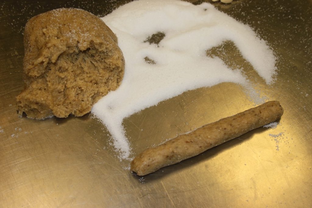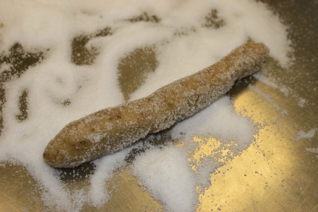 Diviser la pâte en 9 pâtons. Rouler chaque petit pâton en boudin dans le sucre.