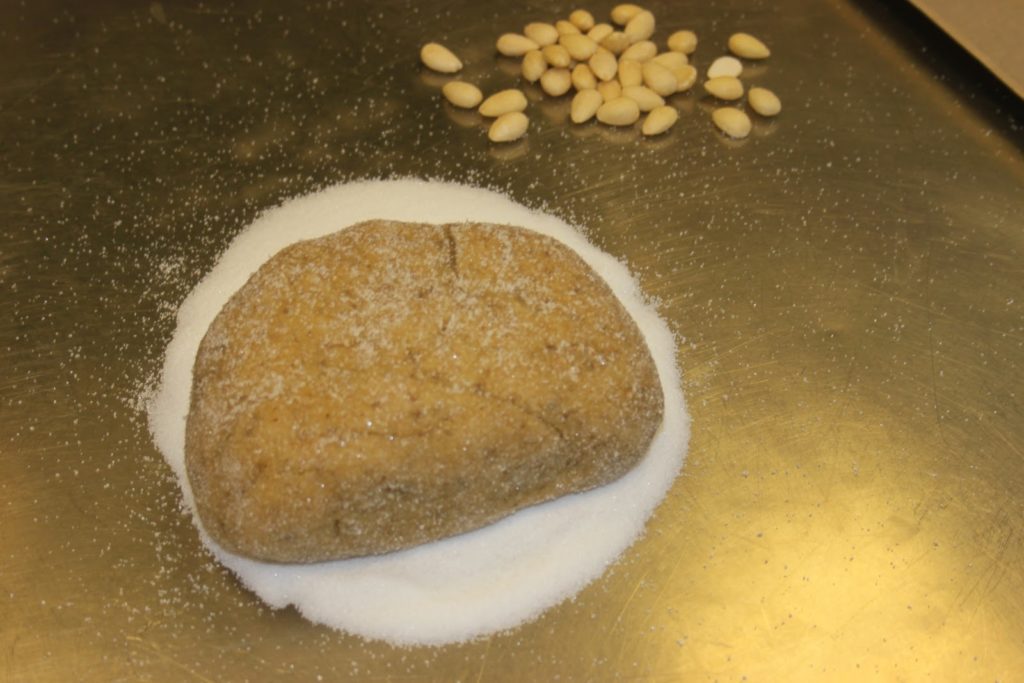 Rouler la pâte dans le sucre et la travailler un peu pour incorporer du sucre.