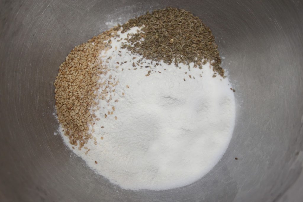 Mettre la farine, le sucre, les graines de sésame et l’anis dans la cuve d’un robot ou dans un grand bol.