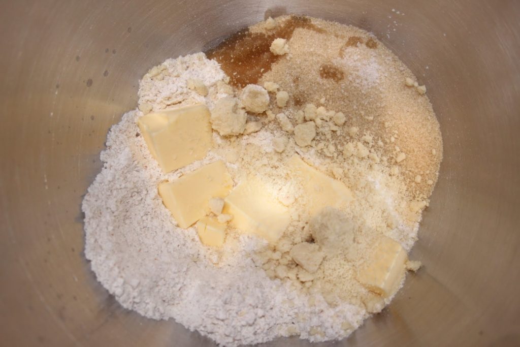 - Mettre la farine d’épeautre, le sucre de canne, le beurre, la poudre d’amandes, le sel et l’extrait d’amande amère dans la cuve d’un batteur.