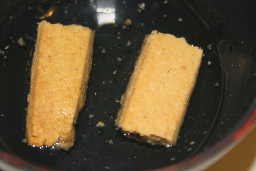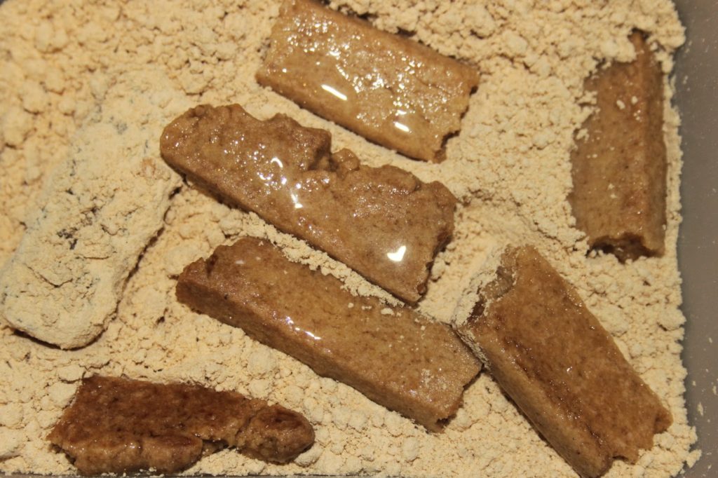 Vous pouvez conserver à ce stade les bandes de pâte cuites dans une boite hermétique. Une fois trempés dans le sirop et roulés dans la farine de kinako, les sablés resteront croquants 2 jours. Faites donc la suite au fur et à mesure de vos besoins (pour une cérémonie du thé par exemple !). Mettez le sirop de canne à sucre dans un bol et cassez à la main des morceaux de sablés que vous trempez une seconde.
