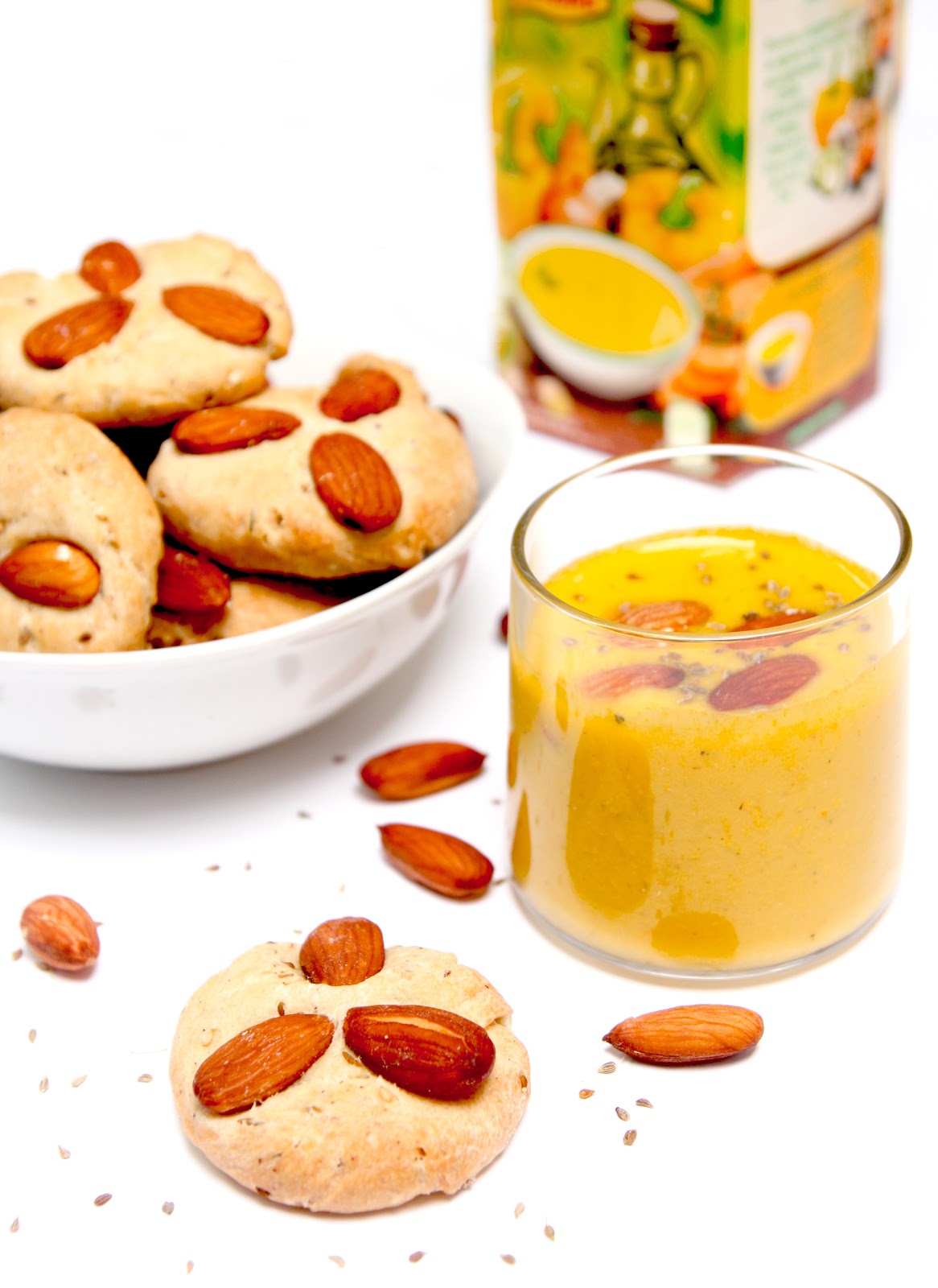 Je continue mon partenariat avec Alvalle (deux recettes par mois jusqu’à août!) et j’en profite pour vous créer des recettes, qui je l’espère, vous plairont… Surtout avec les beaux jours qui reviennent! Cette année par chance, vous le savez, je suis allé en Andalousie et j’ai pu visiter Arcos de la Frontera qui possède une délicieuse recette de sablés sucrés à l’huile d’olive et à l’anis (voir recette ICI). Il ne m’en a pas fallu plus pour avoir envie de vous adapter cette spécialité en version salée, qui accompagnera à merveille ma Soupe Froide Alvalle. Cela donne des petits pains croustillants au cumin, à l’anis, au sésame et à l’huile d’olive, surmontés d’amandes grillées! C’est véritablement addictif…pour l’apéritif!